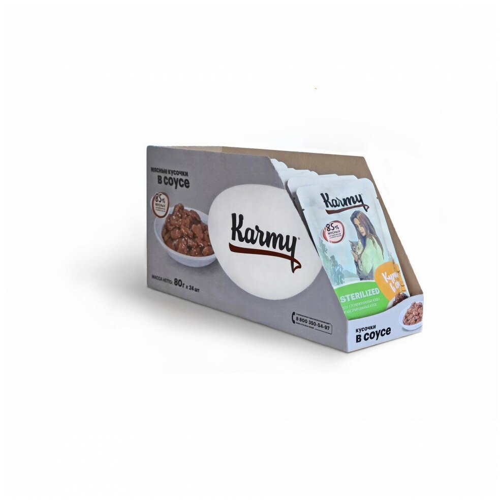 Karmy Sterilized - это порция сочных мясных кусочков в аппетитном желе, приготовленных с учетом особых потребностей стерилизованных кошек и кастрированных котов всех пород старше 1 года. В составе корма только натуральные ингредиенты, а также все необходимые микроэлементы и витамины для сохранения идеального веса и здоровья мочевыделительной системы.
