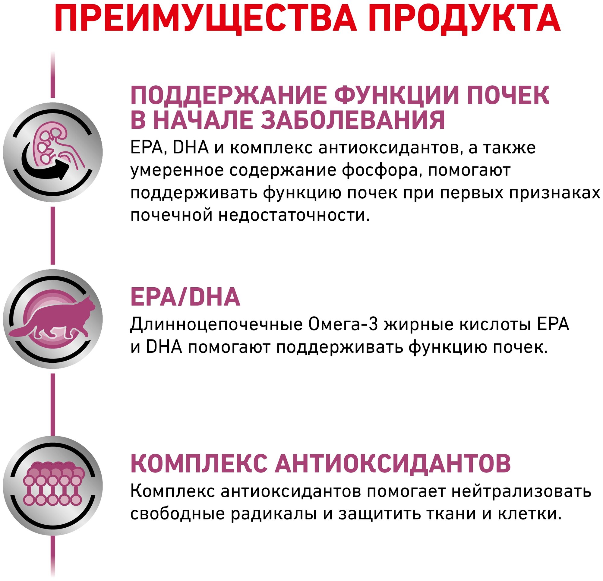 Омега-3 жирные кислоты EPA, DHA и комплекс антиоксидантов, а также умеренное содержание фосфора помогают поддерживать функцию почек при первых признаках недостаточности.