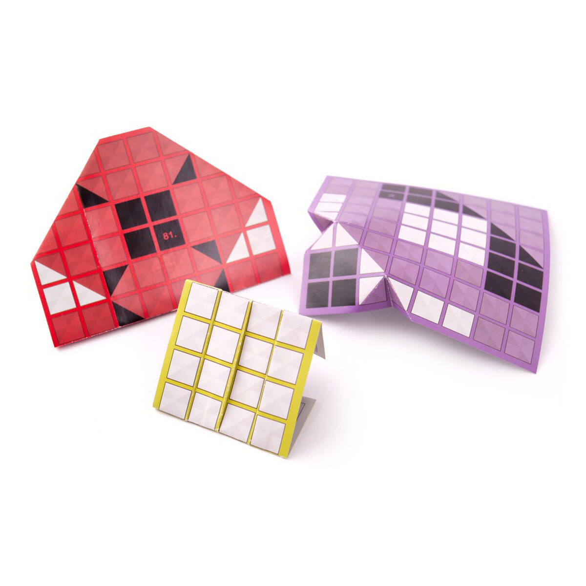 "Квадригами" – это не совсем игра, а скорее набор геометрических задач на логику и восприятие от французских разработчиков для всех почитателей японского искусства оригами. В коробке Вы найдёте 100 листов, которые и являются этими заданиями. Цель игры – свернуть страницы так, чтобы получился квадрат четыре на четыре клетки. Задача усложняется тем, что на одной стороне должны оказаться чёрные квадраты, а на другой – белые. Если задания окажутся слишком тяжёлыми, Вы всегда можете облегчить себе сборку оригами-головоломок, используя сетку сгибов на листках. Развивайте пространственное мышление и мелкую моторику рук вместе с "Квадригами".