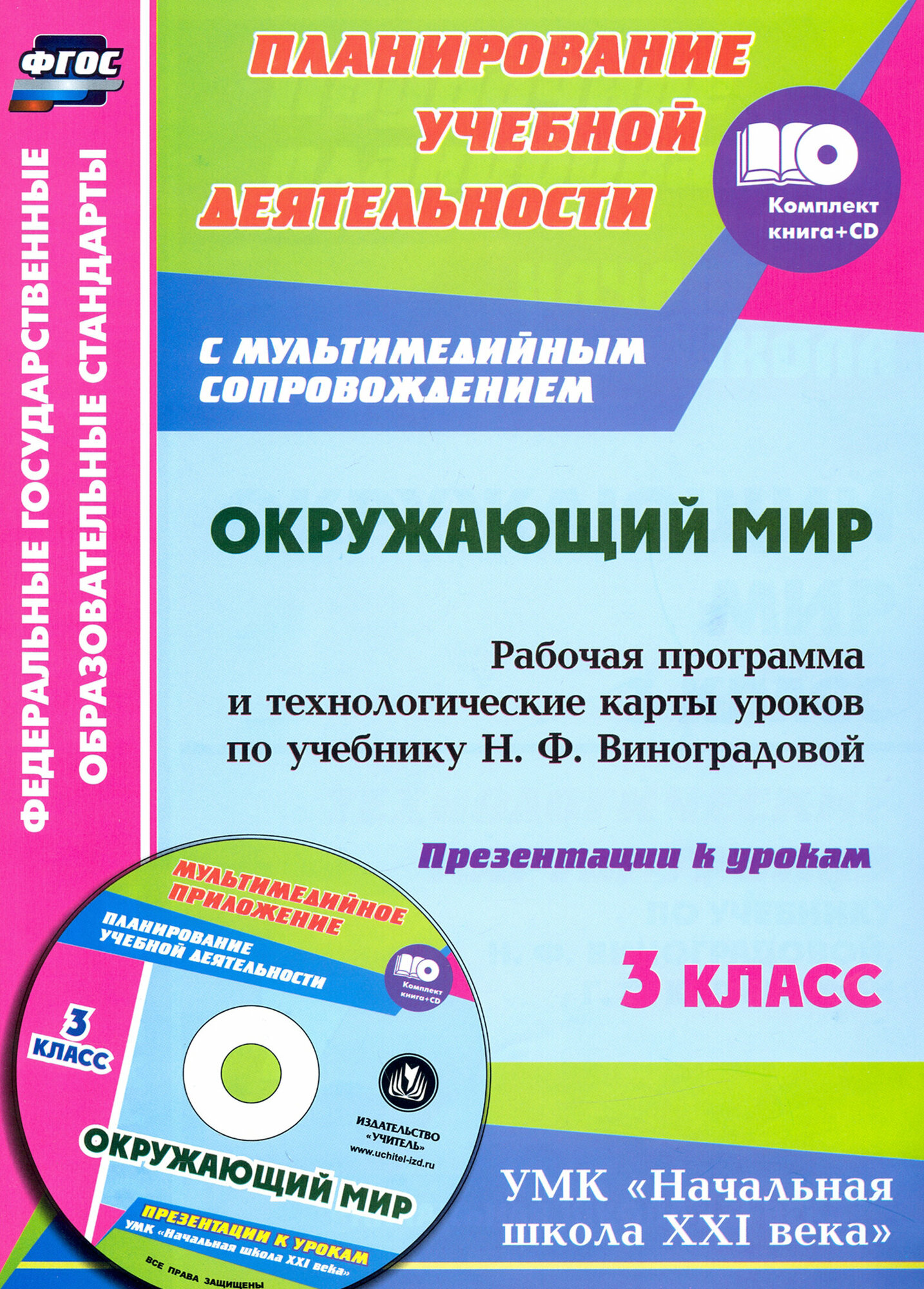 Предлагается комплект (книга + диск), состоящий из пособия с рабочей программой и технологическими картами уроков окружающего мира в 3 классе и мультимедийного приложения с презентациями и видео, разработанный в соответствии с положениями ФГОС НОО, ориентированный на работу по учебнику Н. Ф. Виноградовой, входящему в УМК "Начальная школа XXI века".
