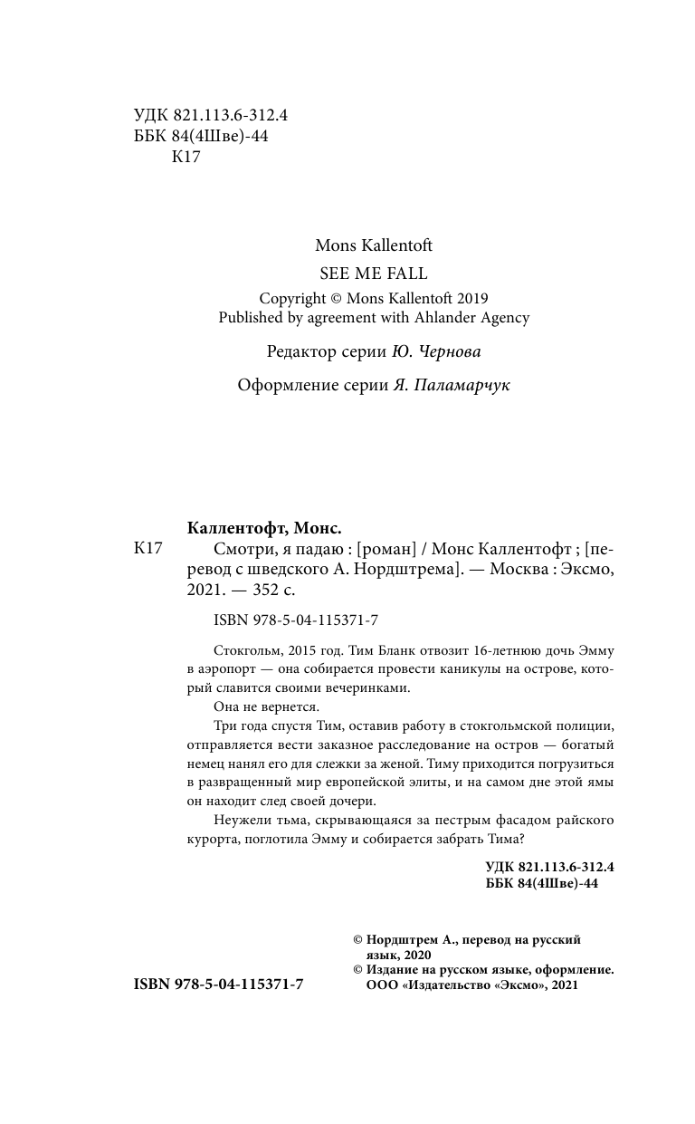 Книга: Смотри я падаю (Монс Каллентофт); Эксмо, Inspiria, Редакция 1, 2020