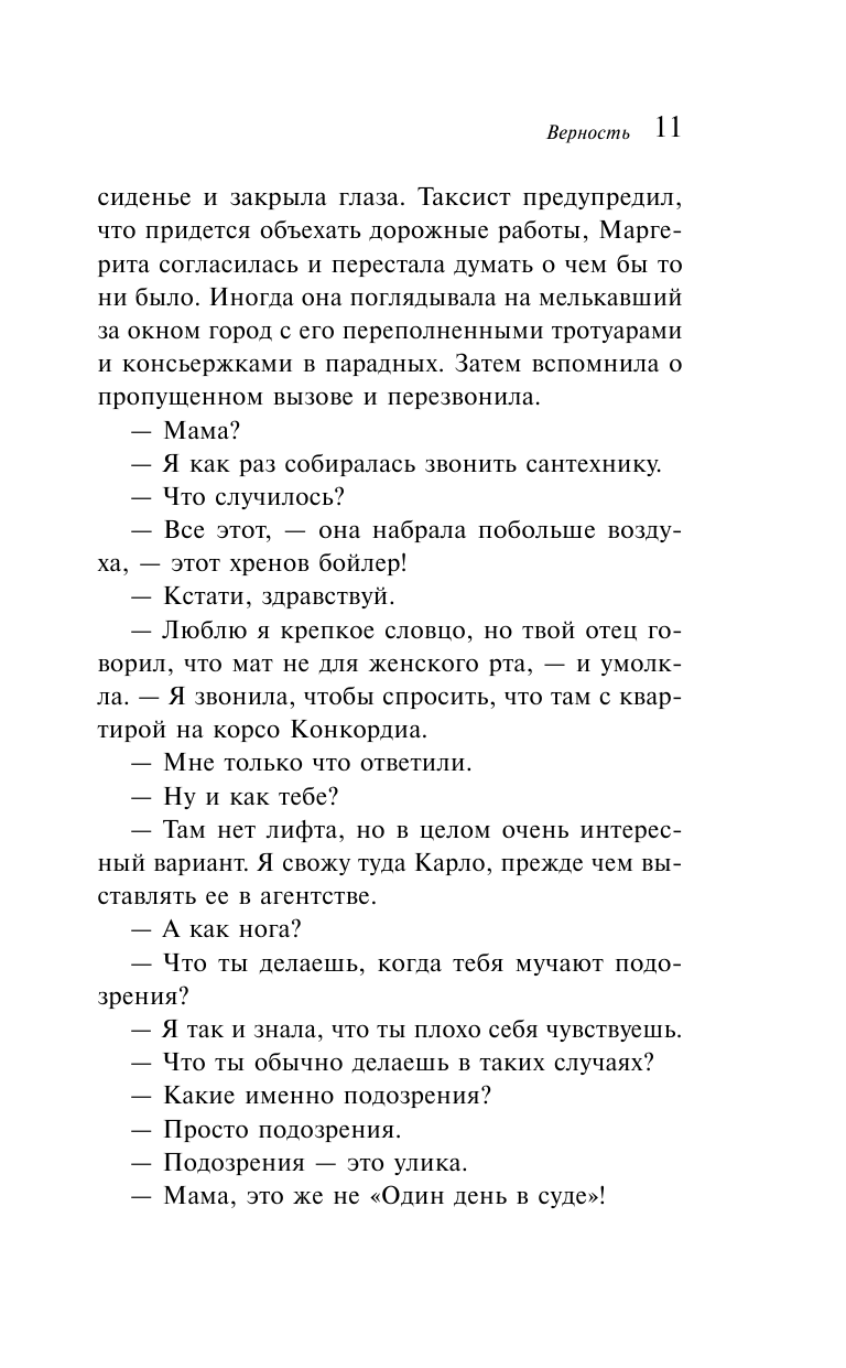 Верность для меня помогла открыть глаза на определенные вещи, которые происходили и в моей жизни, благодаря этой книге я сделала вывод, что главное в жизни, сохранить верность самому себе. Потому что все мы должны пройти через какой-то опыт в жизни и, как бы грустно это не было, но какие-то вещи от супругов лучше скрывать, так поступили Карло и Маргерита.