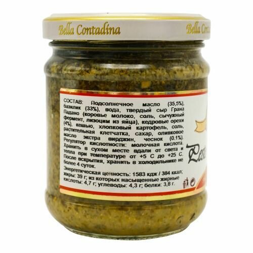 | Состав | подсолнечное масло 35.5%, базилик 33%, вода, твердый сыр Грана Падано (коровье молоко, соль, сычужный фермент, лизоцим из яйца), кедровые орехи 4%, кешью, хлопковый картофель, соль, растительная клетчатка, сахар, оливковое масло экстра вирджин, чеснок 0.1%, регулятор кислотности молочная кислота |