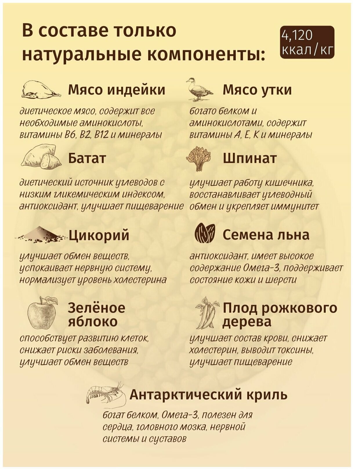 | Состав | Дегидрированное мясо утки, Дегидрированное мясо индейки, Сушеный сладкий картофель (батат), Свежее мясо утки, Жир индейки, Сушеный шпинат, Экстракт цикория (естественный источник FOS и инулина), Мука из плода рожкового дерева, Сушеное яблоко, Сушеный Антарктический Криль (естественный источник EPA и DHA), Семена льна, DL-Метионин, Глюкозамин, Хондроитин, МСМ (Метилсульфонилметан), Комплекс натуральных антиоксидантов (Экстракт Розмарина, Грейпфрута, Апельсина, Куркумы и Сизигиума). Сохранено витамином С, розмарином и смесью природных токоферолов (источник натурального витамина Е). Метаболическая энергия составляет: 4,120 ккал/кг Анализ %: Протеин |