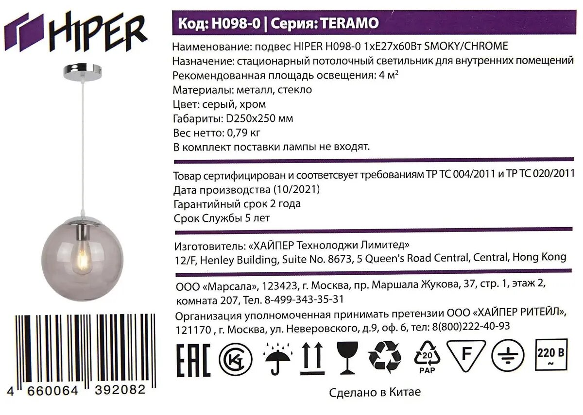 Подвесной светильник Teramo - продукт известной компании Hiper (Англия). Имеет максимальную мощность 60 Вт, освещает площадь до 4 кв. м. Отлично подойдет для таких мест, как гостиная, кабинет, кухня, над кухонным островом. Впишется в интерьеры следующих стилей: модерн.