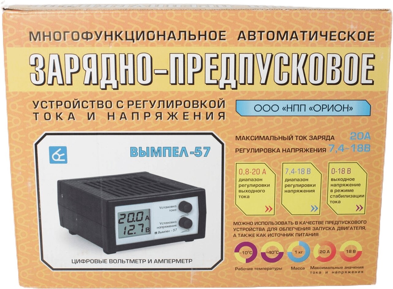 | Прочие особенности и свойства | Зарядно-предпусковое устройство Вымпел 57 2048 - современное приспособление для зарядки аккумуляторных батарей любой емкости и типа. Агрегат успешно применяется в качестве питания автомобильных, лодочных, а также мотоциклетных аккумуляторов.,,Ток заряда регулируется в диапазоне от 0.8 до 20 А. Регулировка напряжения происходит ручным путем в диапазоне от 7.4 до 18 В. Модель имеет встроенную защиту от переполюсовки. |