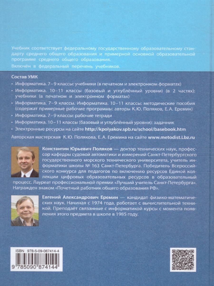 Учебник предназначен для изучения информатики на базовом и углублённом уровнях в 11 классах общеобразовательных организаций. Содержание учебника является продолжением курса 10 класса и опирается на изученный в 7-9 классах курс информатики для основной школы.