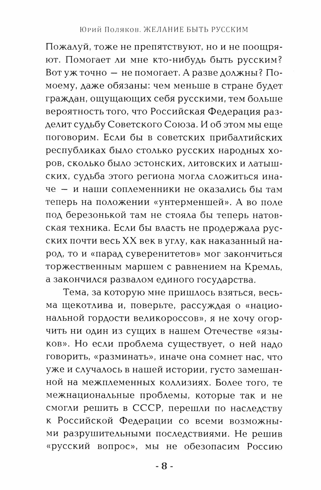 Важная и нужная книга для всех, кто переживает за судьбу народов России, и её главной опоры во все времена - русских, почему-то оказавшихся в своей стране в наиболее сложном положении. Ю.Поляков рассказывает о противоречивых исторических и культурных процессах серьёзно и увлекательно, приводя много интересных и не всегда удобных фактов. Можно соглашаться или не соглашаться с какими-то выводами писателя, но в книге нет фальши, она написана человеком искренним и неравнодушным. Да, у каждой нации много трагедий на историческом пути, хватает и обид на соседей, но о русских трагедиях всё больше предпочитают помалкивать. Юрий Поляков не боится сложных или неудобных вопросов, готов к дискуссии и полемике. Его волнуют не узкоместечковые проблемы, а как истинного патриота, судьба великой страны и всех народов, населеющих её.