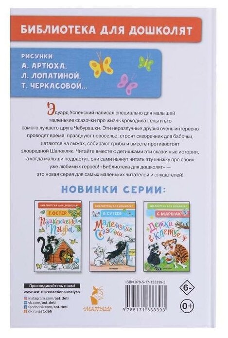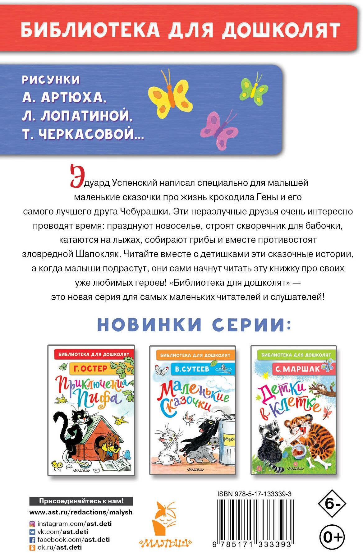 Эдуард Успенский написал специально для малышей маленькие сказочки про жизнь крокодила Гены и его самого лучшего друга Чебурашки. Эти неразлучные друзья очень интересно проводят время: празднуют новоселье, строят скворечник для бабочки, катаются на лыжах, собирают грибы и вместе противостоят зловредной Шапокляк. Читайте вместе с детишками эти сказочные истории, а когда малыши подрастут, они сами начнут читать эту книжку про своих уже любимых героев! "Библиотека для дошколят" - это новая серия для самых маленьких читателей и слушателей!