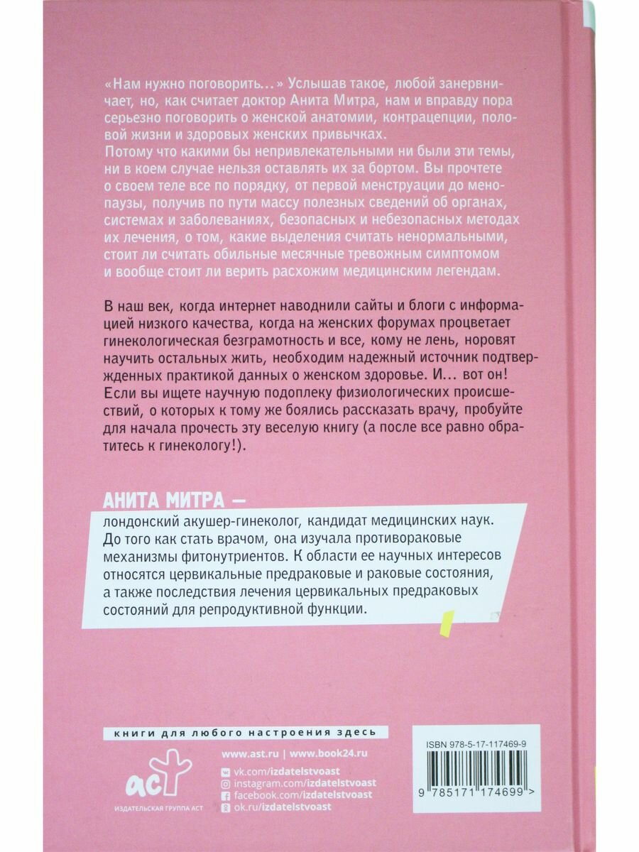"Нам нужно поговорить…" Услышав такое, любой занервничает, но, как считает доктор Анита Митра, нам и вправду пора серьезно поговорить о женской анатомии, контрацепции, половой жизни и здоровых женских привычках. Потому что какими бы непривлекательными ни были эти темы, ни в коем случае нельзя оставлять их за бортом. Вы прочтете о своем теле все по порядку, от первой менструации до менопаузы, получив по пути массу полезных сведений об органах, системах и заболеваниях, безопасных и небезопасных методах их лечения, о том, какие выделения считать ненормальными, стоит ли считать обильные месячные тревожным симптомом и вообще стоит ли верить расхожим медицинским легендам.