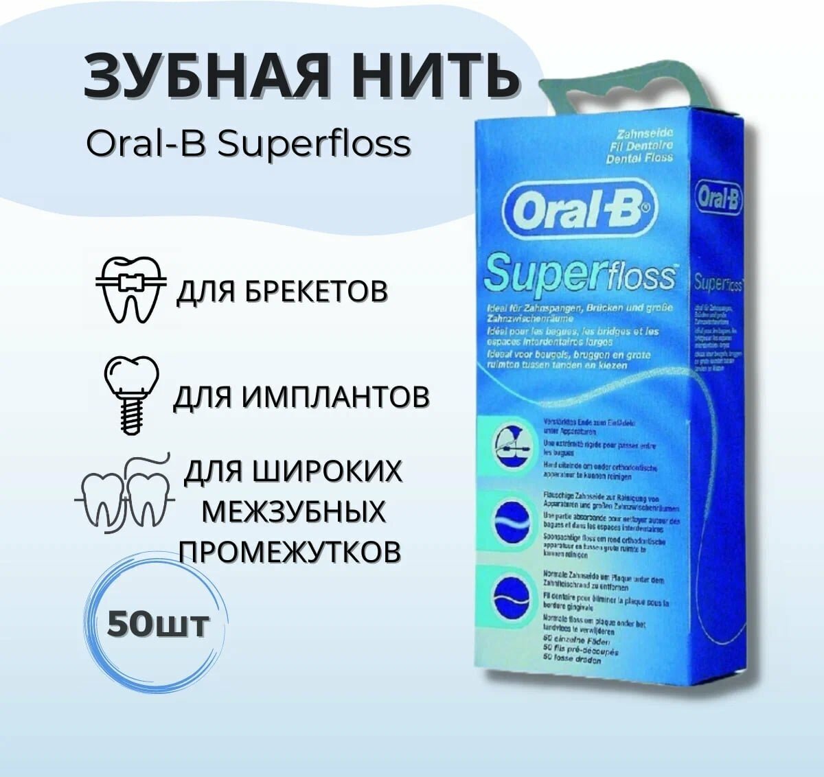 | Полное наименование | Зубная нить Oral-B Super floss, с мятным вкусом (50 шт) |