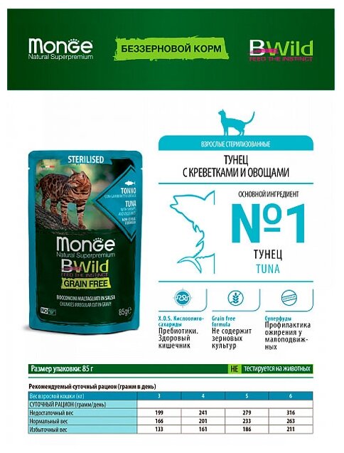 Влажный корм для кошек Monge Bwild Grain free из тунца с креветками и овощами для стерилизованных пауч 0085 кг