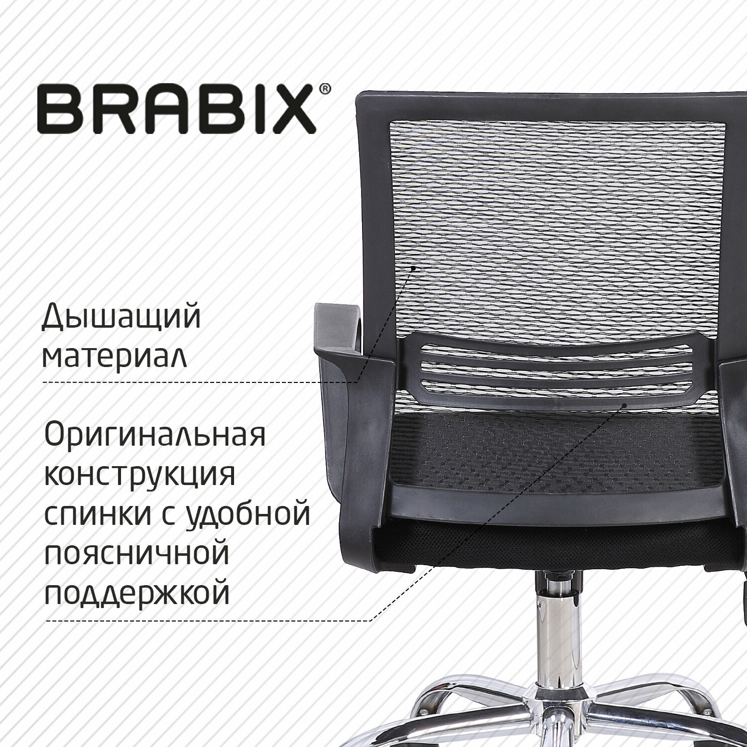 Спинка кресла выполнена из прочного сетчатого акрила с оригинальным узором. Материал обладает высокой воздухопроницаемостью, легко чистится, способен подстраиваться под физиологические изгибы спины, при этом сохраняет форму и не растягивается. Залогом комфортного использования кресла также является эргономичная форма надёжного пластикового каркаса.