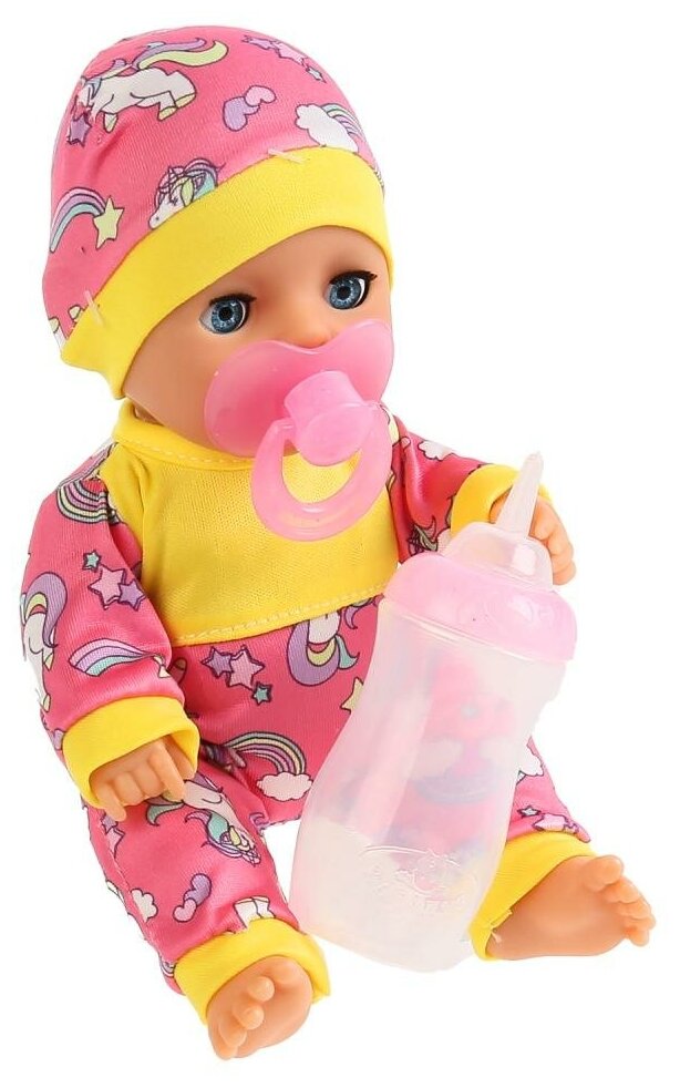 Этот милый пупс, с детально проработанным личиком, обязательно понравится вашей малышке. Кукла одета в симпатичный розово-жёлтый костюмчик с принтом в виде единорогов и шапочку такой же расцветки. Одежда легко надевается и снимается.
