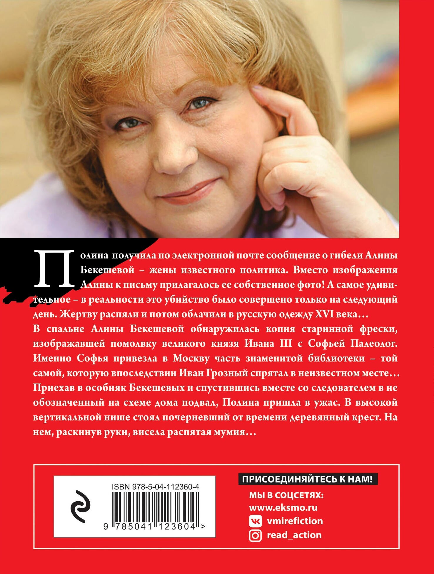 Полина получила по электронной почте сообщение о гибели Алины Бекешевой - жены известного политика. Вместо изображения Алины к письму прилагалось ее собственное фото! А самое удивительное - в реальности это убийство было совершено только на следующий день. Жертву распяли, и потом облачили в русскую одежду XVI века. В спальне Алины Бекешевой обнаружилась копия старинной фрески, изображавшей помолвку великого князя Ивана III c Софьей Палеолог. Именно Софья привезла в Москву часть знаменитой библиотеки - той самой, которую впоследствии Иван Грозный спрятал в неизвестном месте. Приехав в особняк Бекешевых и спустившись вместе со следователем в не обозначенный на схеме дома подвал, Полина пришла в ужас. В высокой вертикальной нише стоял почерневший от времени деревянный крест. На нем, раскинув руки, висела распятая мумия.