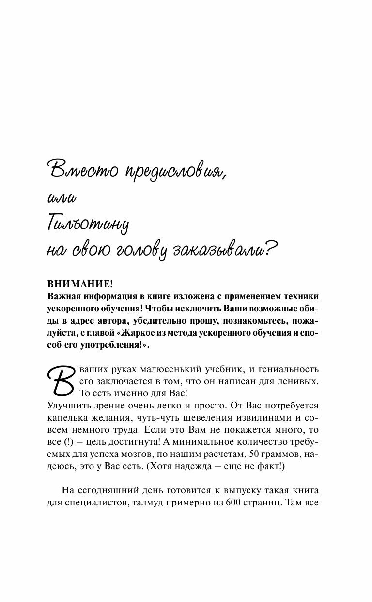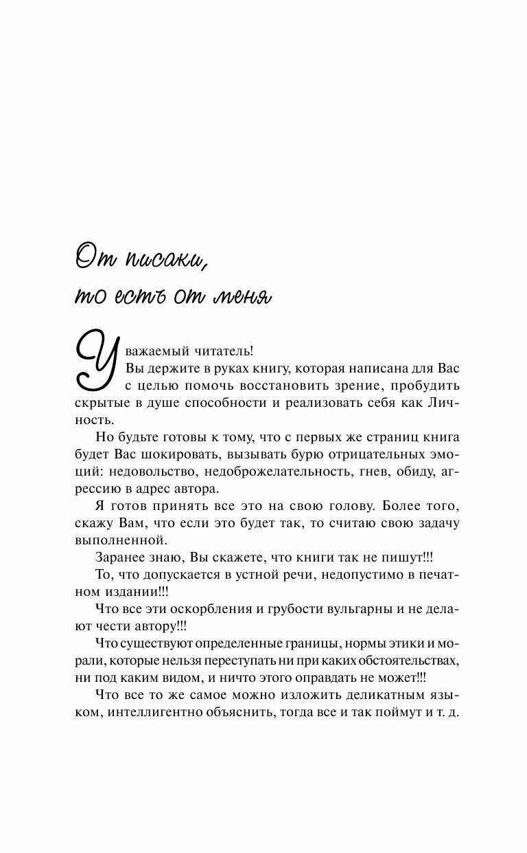 Вы держите в руках необычную книгу. Это не просто пособие по ускоренному обучению восстановления зрения, не просто трактат по философии для хронического больного-неудачника, а, скорее, руководство к действию. Здесь раскрывается, система, признанная Международной ассоциацией независимых экспертов как самая эффективная среди известных с 1998 года альтернативных оздоровительных систем. Трудно определить жанр этой книги. Возможно, потому, что такого просто еще нет.