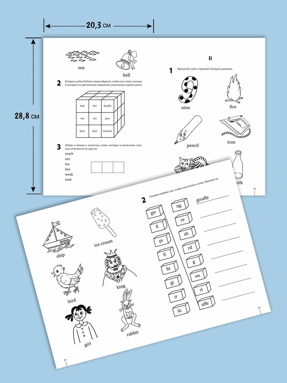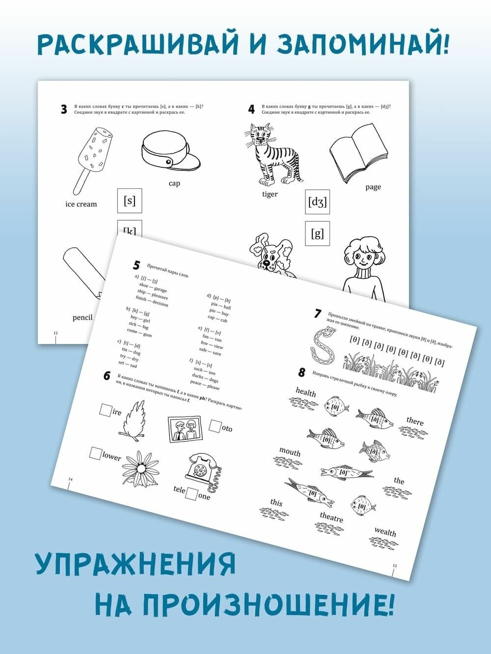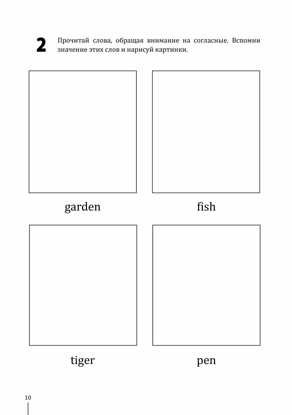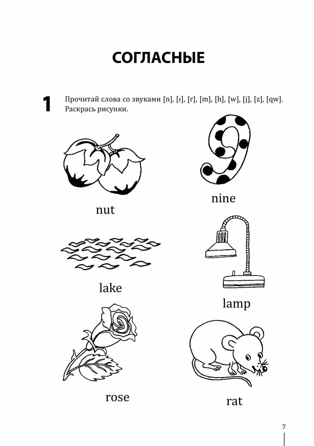 Замечательные рисунки можно раскрашивать ребенку. Задания выполнять вместе с ребенком: попробуйте не только раскрашивать. Пусть ребенок сам тоже рисует и подписывает на английском. Last but not least: в книге дана транскрипция Н Е Р У С С К И М И буквами. Успехов всем!