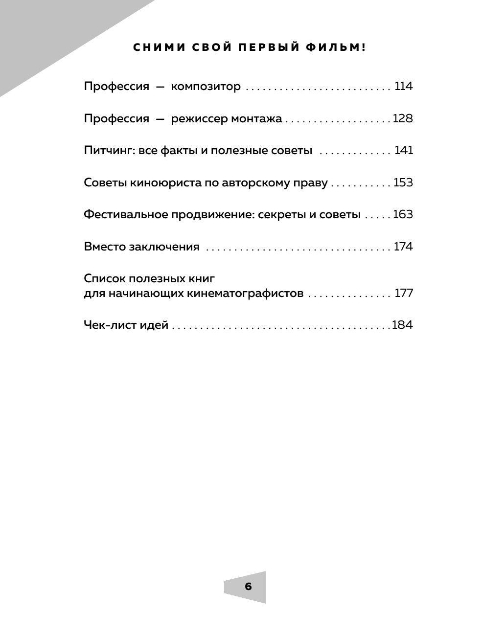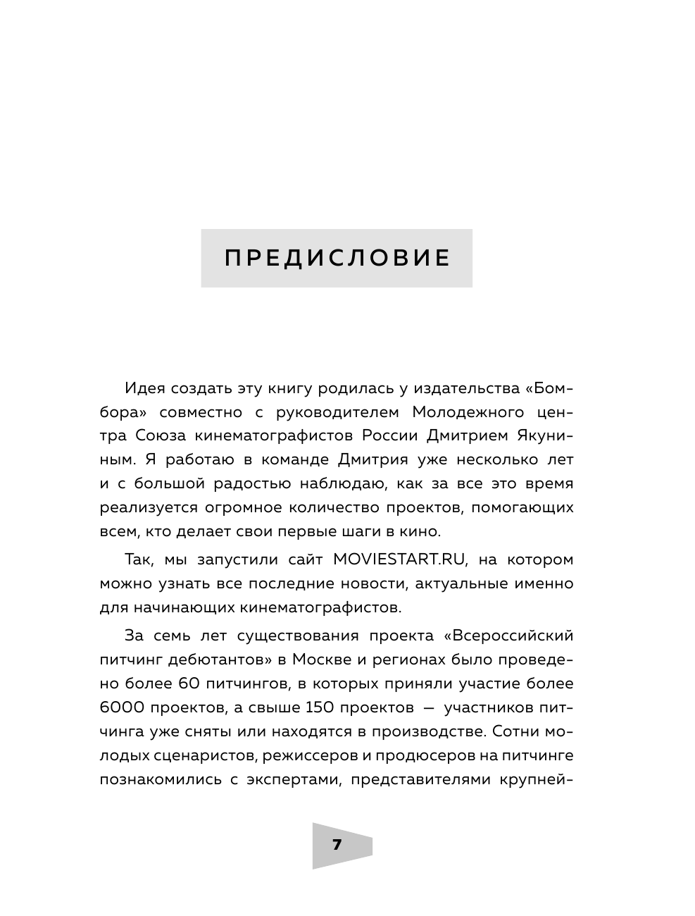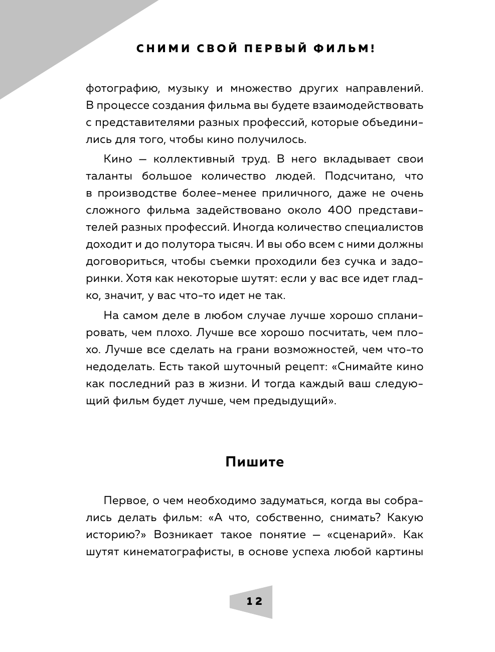 Эта книга для тех, кто делает первые шаги в кинопроизводстве. Профессионалы индустрии, такие как сценарист фильмов "Лед" и "Лед 2" Андрей Золотарев, режиссер "72 метров" Владимир Хотиненко, продюсер "Питер FM" Елена Гликман, режиссер монтажа фильма "Метро" Дарья Гладышева и другие вспоминают свои дебютные работы и делятся опытом с будущими коллегами. Отдельное внимание уделено в книге авторским правам, питчингу — презентации проектов перед инвесторами — и участию в фестивальных показах.