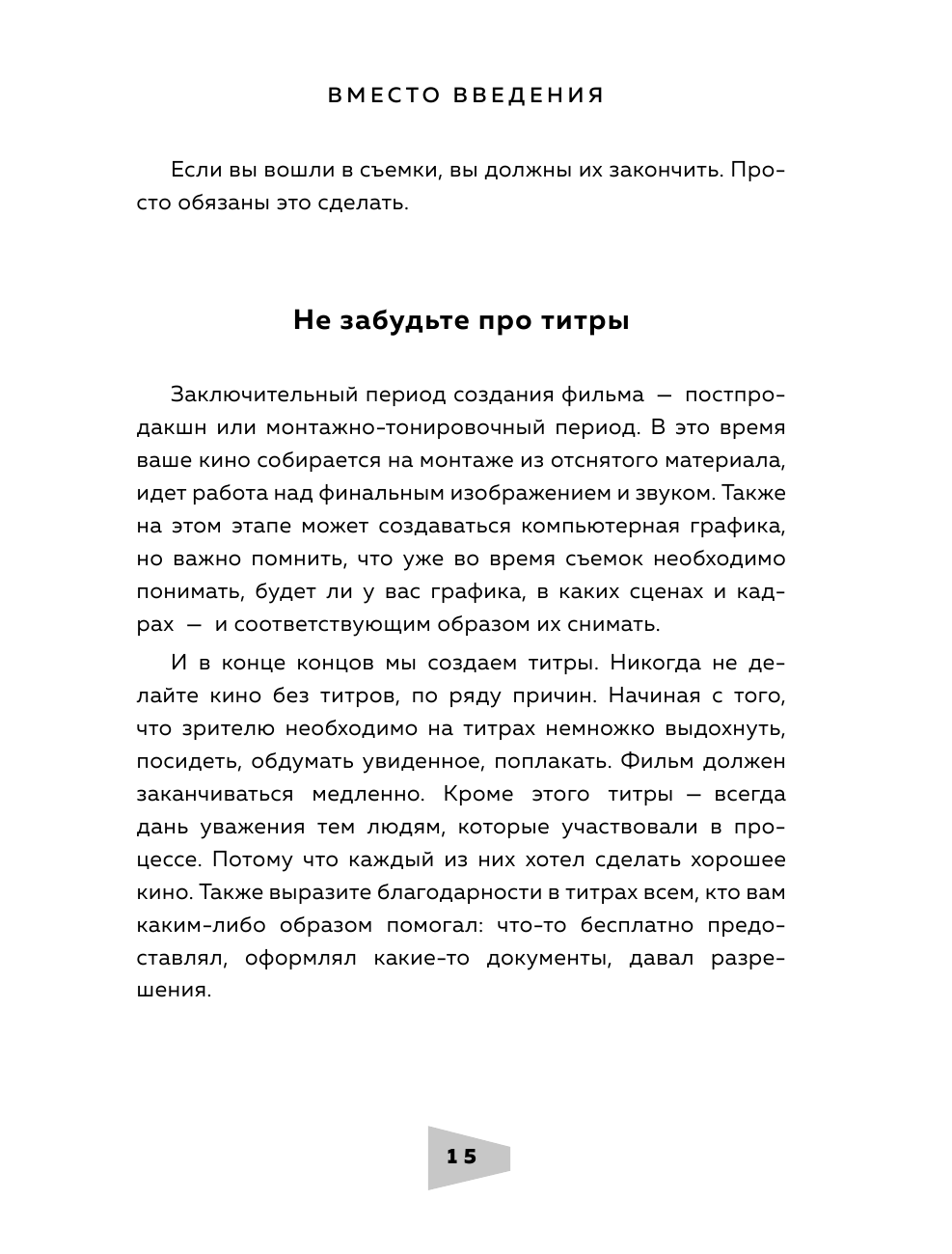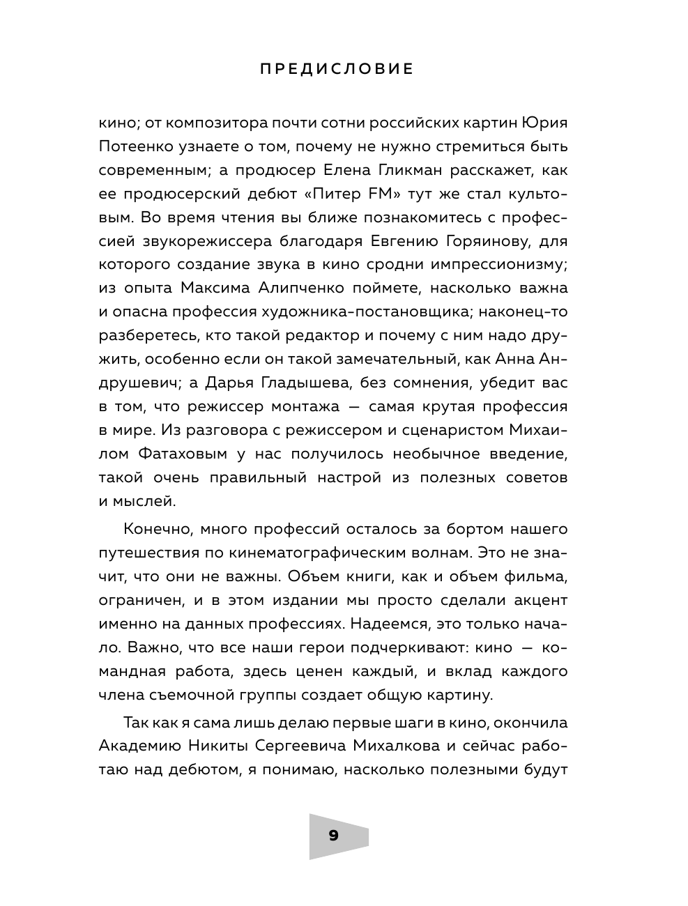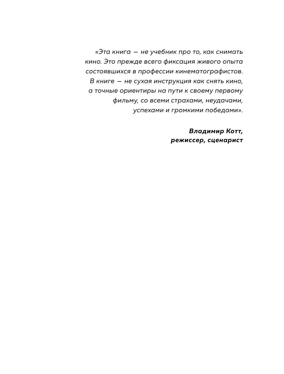 Эта книга для тех, кто делает первые шаги в кинопроизводстве. Профессионалы индустрии, такие как сценарист фильмов "Лед" и "Лед 2" Андрей Золотарев, режиссер "72 метров" Владимир Хотиненко, продюсер "Питер FM" Елена Гликман, режиссер монтажа фильма "Метро" Дарья Гладышева и другие вспоминают свои дебютные работы и делятся опытом с будущими коллегами. Отдельное внимание уделено в книге авторским правам, питчингу — презентации проектов перед инвесторами — и участию в фестивальных показах.