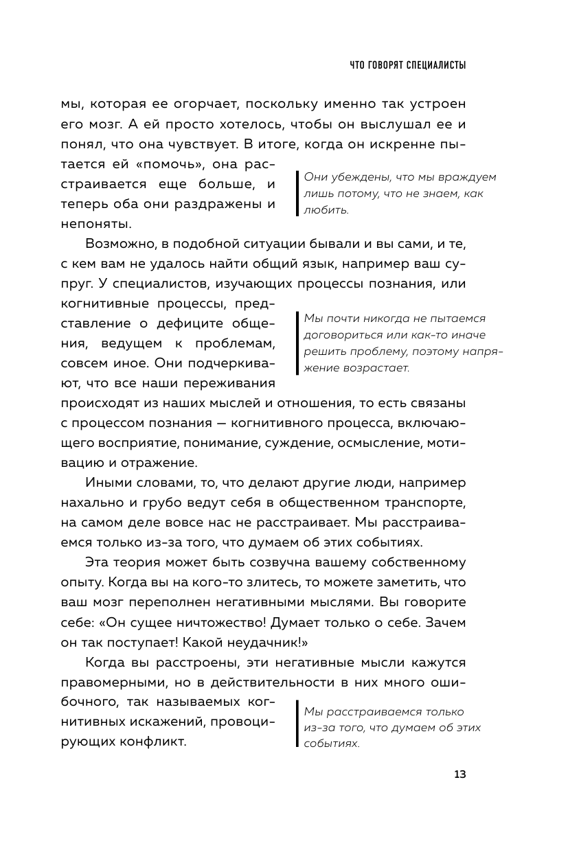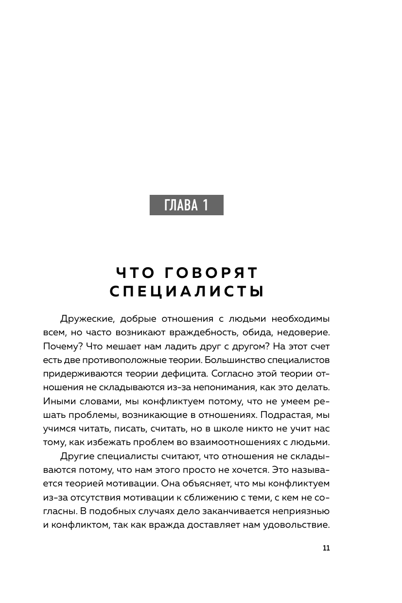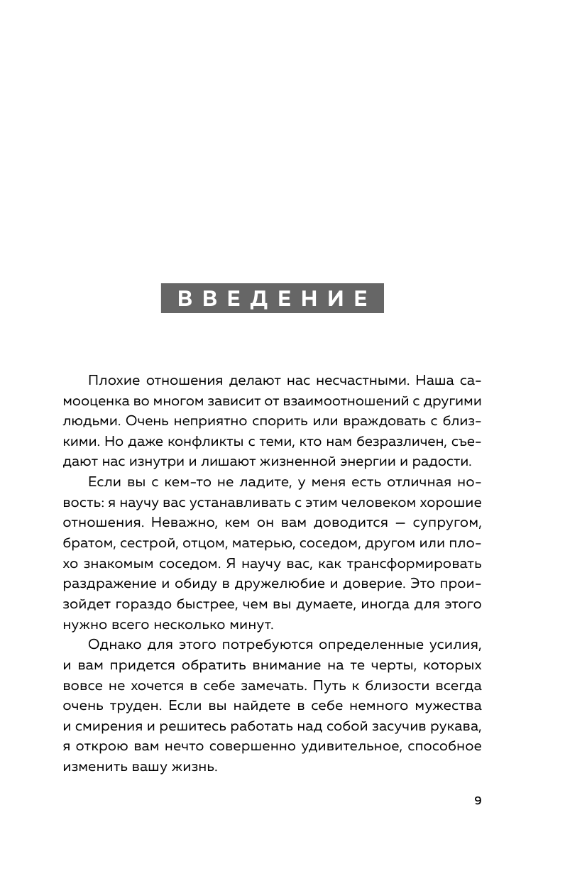 Наша самооценка во многом зависит от взаимоотношений с людьми. Когда что-то не ладится с родными и близкими, мы чувствуем себя несчастными. И даже конфликты с людьми, которые нам безразличны, порой выбивают из колеи. Но часто мы не только не знаем, как решить проблему, а наоборот - усугубляем ситуацию. Почему так происходит? Что мешает нам избегать взаимных претензий и ссор? Можно ли улучшить уже испорченные отношения? И если да, что для этого нужно сделать? Книга известного американского психолога отвечает на эти и многие другие вопросы. Автор уверен: каждый человек может научиться устанавливать хорошие отношения с окружающими и нивелировать как сиюминутные, так и затяжные конфликты. В книге нет долгих, обстоятельных теоретических рассуждений - есть масса полезных рекомендаций, основанных на реальных примерах. Это отличное практическое руководство для всех, кто хочет радоваться общению и жить счастливо.