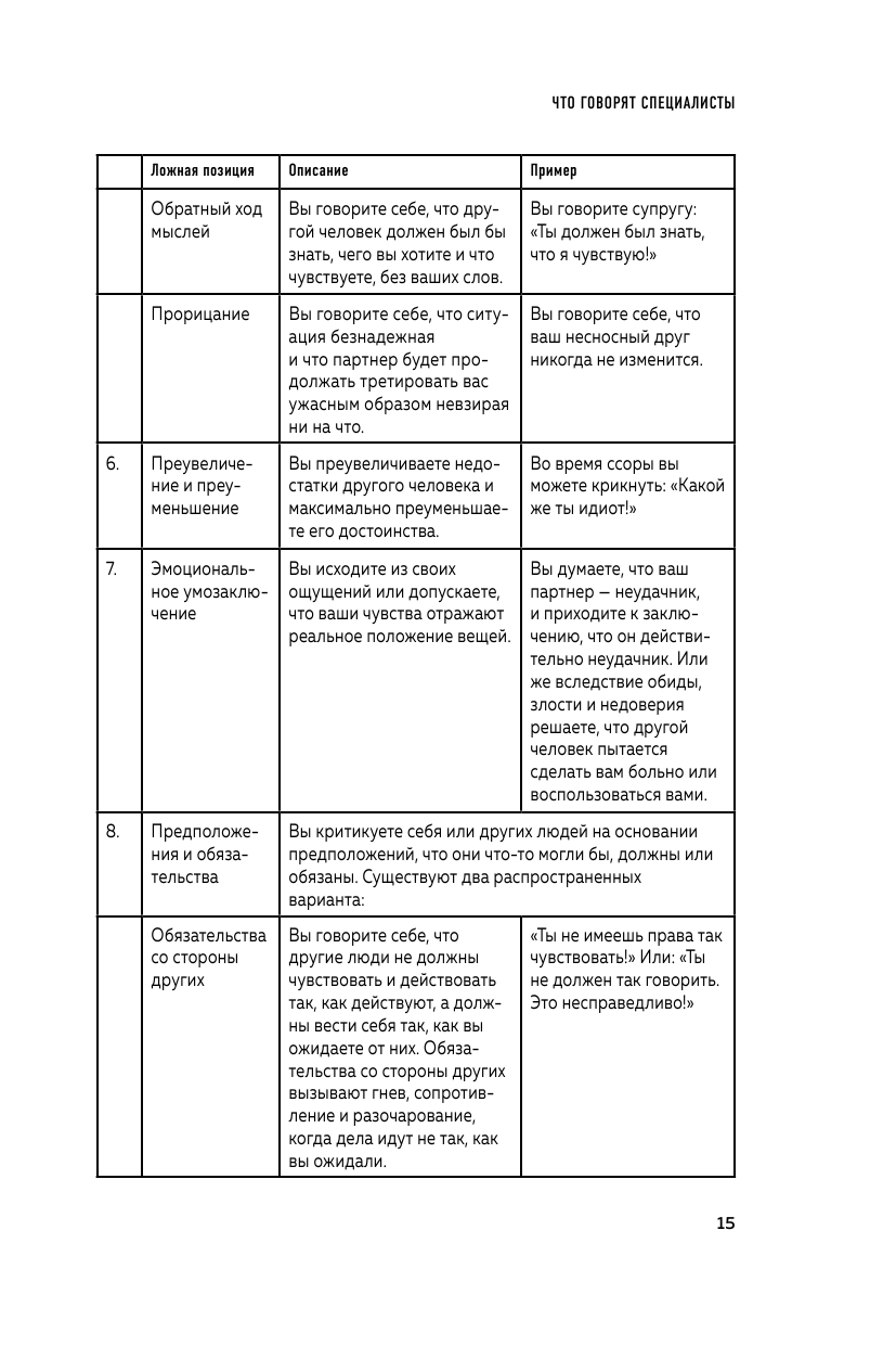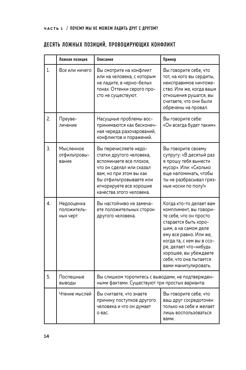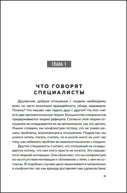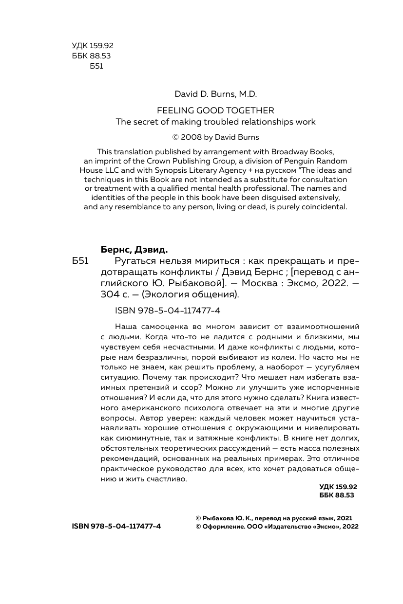 Отличная книга на тему взаимоотношений и разрешения конфликтов) Автор, доктор медицины в Стэнфорде, затрагивает не только конфликты - он говорит и об устройстве нашей о психики, о взаимоотношениях в целом и о причинах, которые делают хорошее общение плохим. Составляющие хорошего общения, согласно Д. Бернсу: сопереживание, позитивность и уважение. Как их достичь? Для этого автор предлагает пять секретов: обезоруживающие приемы, сопереживание, вопрос, «я чувствую» и поглаживание. Некоторые из них, наверно, звучат странно и непонятно, но все подробно объясняются в книге, так что сомнений не остается) Также автор предлагает различные упражнения, списки, тесты, варианты, как наладить распространенные проблемы во взаимоотношениях. Речь про общение с нытиками, нарциссами, лентяями, упрямцами, тиранами, ревнивцами, критиками и др. Книга дает конкретные инструкции и учит избегать ловушек. В общем, советую всем, кто столкнулся с трудностями в общении)