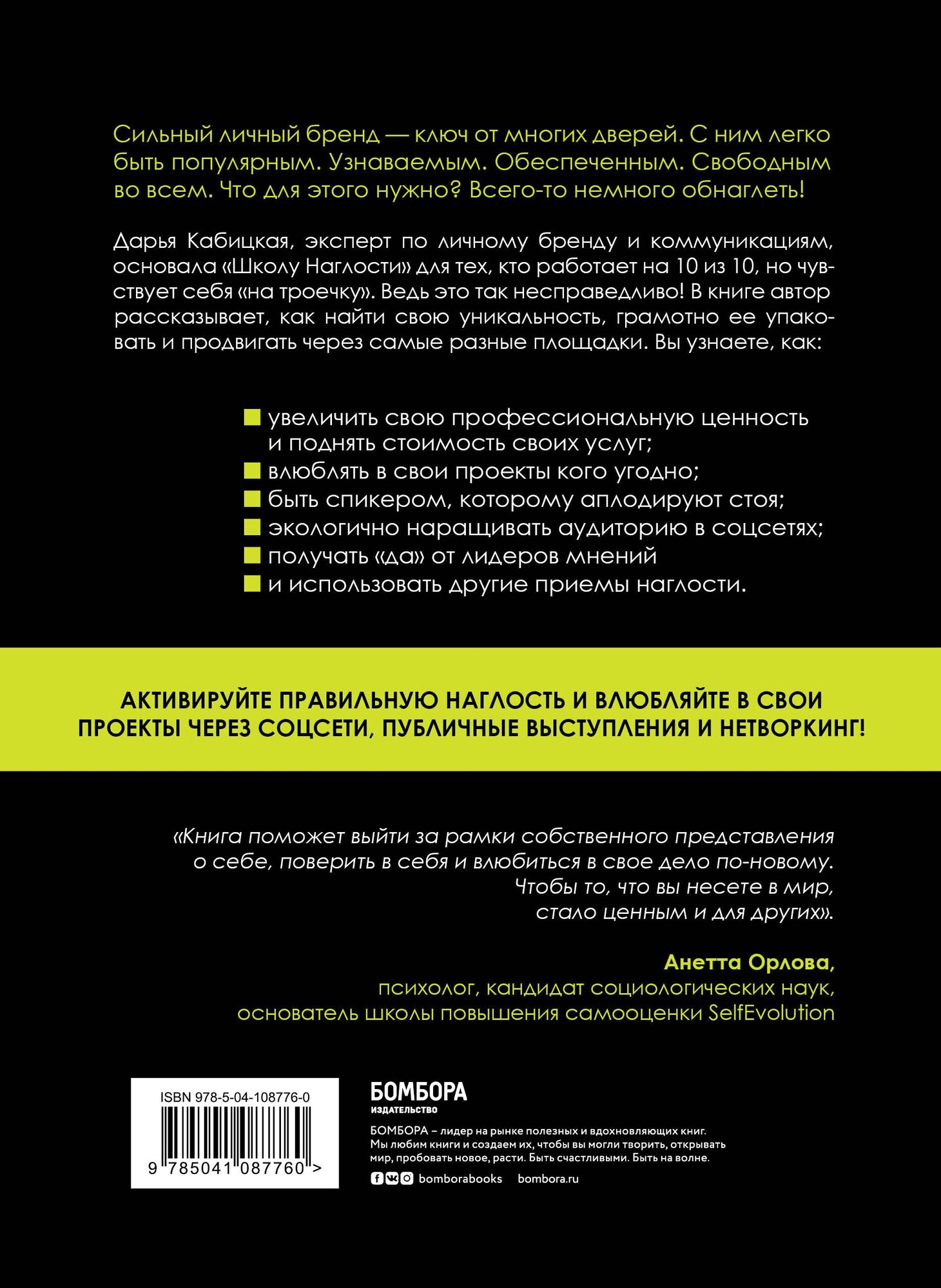Дарья Кабицкая, эксперт по личному бренду и коммуникациям, основала "Школу Наглости" для тех, кто работает на 10 из 10, но чувствует себя "на троечку". Ведь это так несправедливо! В книге автор рассказывает, как найти свою уникальность, грамотно ее упаковать и продвигать через соцсети, публичные выступления и нетворкинг.