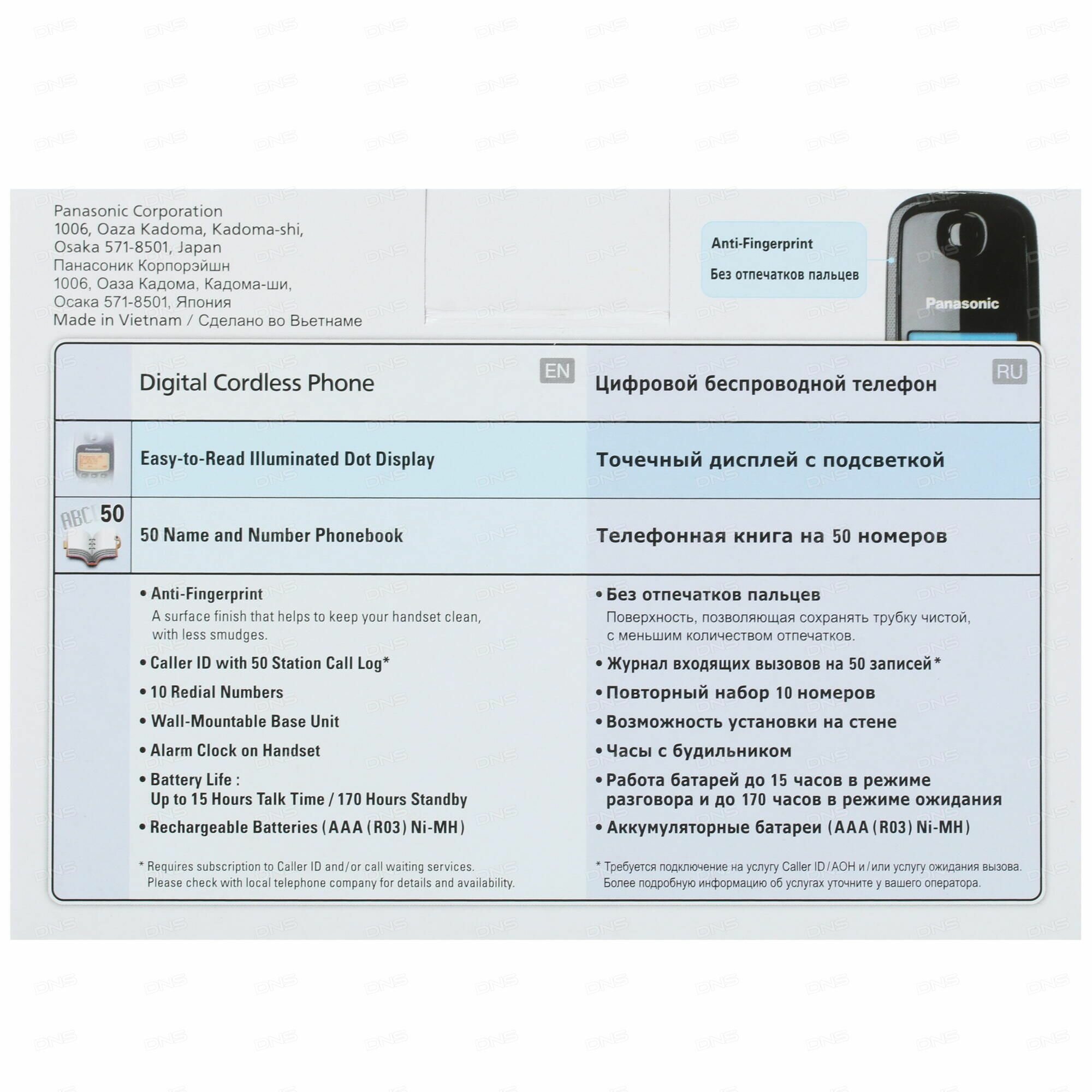 | Дополнительные функции | календарь (время/дата), будильник, поиск трубки, повторный набор (10 номеров), выбор мелодии звонка (12 шт.), информация о дате и времени вызова |