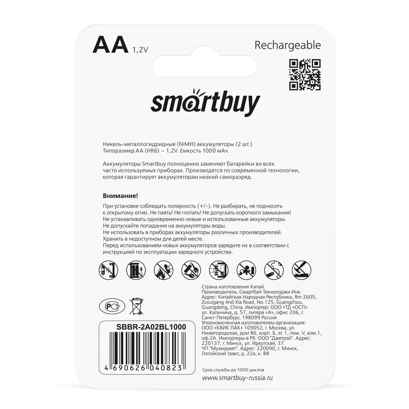 Модель: NiMh AA/2BL 1000 mAh (SBBR-2A02BL1000)