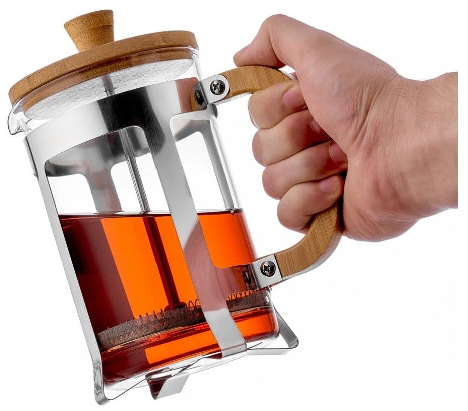 Френч-пресс предназначен для заваривания кофе, хотя многие используют его для заваривания чая. Насыпьте кофе или чай в колбу, залейте горячей водой, опустите пресс-фильтр и оставьте настаиваться. Молотый кофе или чаинки пресс-фильтр плотно прижмет к дну кофейника, а уплотнительное кольцо не даст им попасть в напиток. При таком способе заваривания кофе и чай постоянно контактируют с жидкостью. Поэтому процесс заваривания не останавливается. Для кофе это хорошо потому, что при настаивании, напиток приобретает все более насыщенный вкус. Если вы завариваете чай, то контролируйте крепость заваривания количеством насыпаемой заварки.