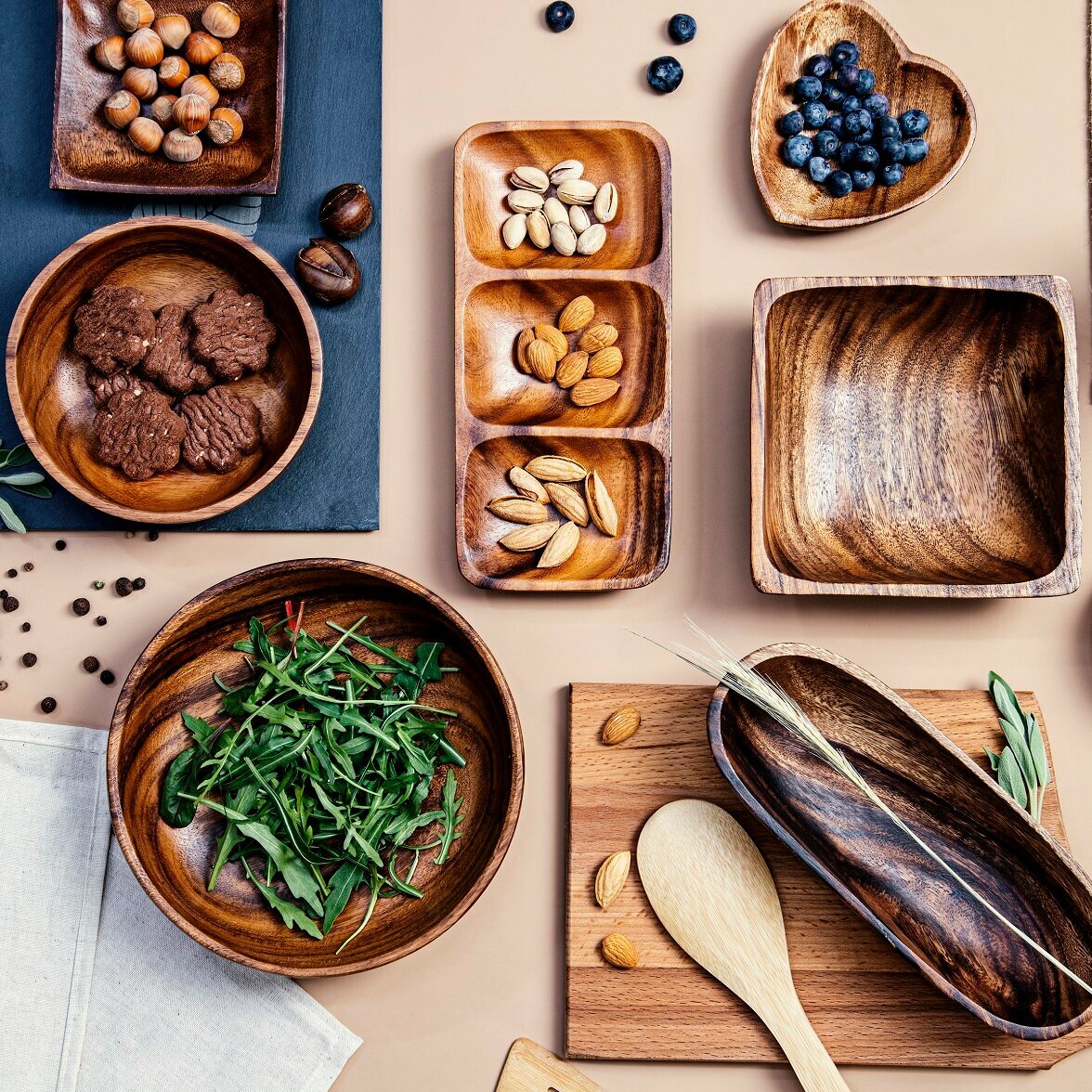 Предметы сервировки вырезаны вручную из цельного массива. У древесины очень выразительная текстура: филиппинская акация бывает разных оттенков, от соломенно-светлых до глубоких шоколадных, и имеет шелковистый блеск.