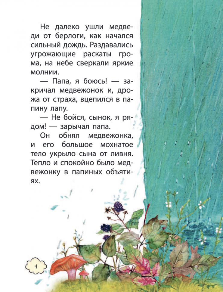 Как же спокойно медвежонку рядом с папой! Он и от дождя укроет, и мёд найдёт, и злого зверя подальше отгонит… Разве мог медвежонок представить, что однажды папа превратится в трусливого зайчонка? Придётся теперь сыну беречь и защищать отца. Дело нехитрое — просто надо проявить находчивость и ничего не бояться!