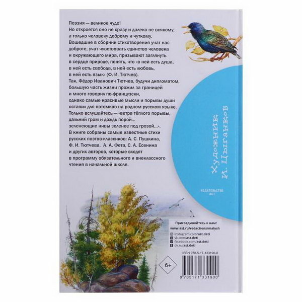 Отличный сборник! Прекрасная побдорка стихов отечественных поэтов-классиков! Замечательные реалистичные иллюстрации природы, которые дополняют эти стихи (хотя стихи сами по себе столь ярко и образно написаны, что их можно читать и без них). Очень жаль, что сегодня дети очень мало читают, и о природе в том числе. Рекомендую для деток и их родителей