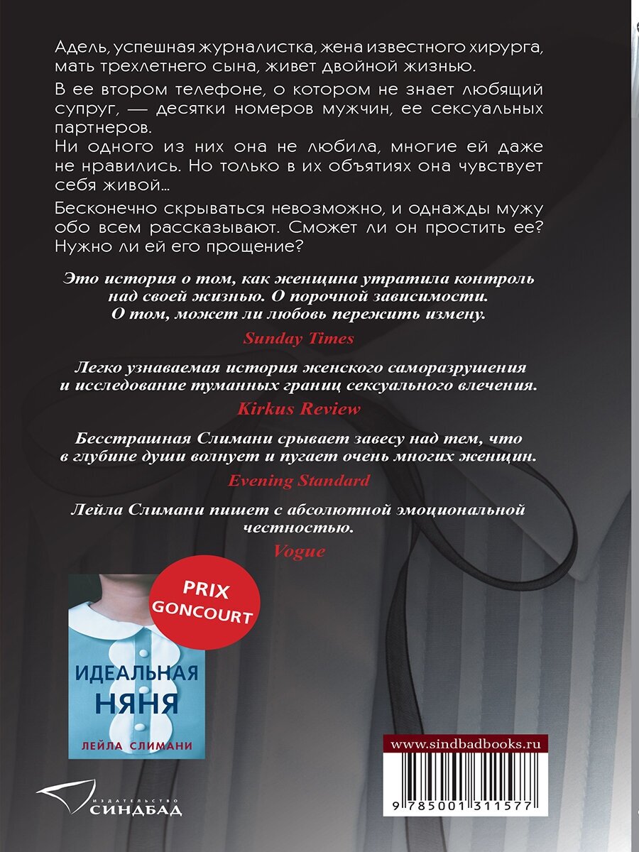 Жизнь журналистки Адель со стороны выглядит практически идеальной. У нее хорошая работа, она замужем за успешным хирургом, у них прекрасный трехлетний сын, они живут в большой квартире в фешенебельном районе Парижа… Но за близким к идеалу фасадом — разочарование во всех и во всем и всепоглощающая, неутолимая потребность в сексе. Когда на Адель «накатывает» — а случается это нередко, — она готова отдаться первому встречному, забыв обо всем на свете... Потом она дает себе клятву: «никогда больше». Пока не случится новый приступ. «Адель» — захватывающее исследование брака, сексуальности, порочной зависимости и пределов женской свободы, мастерски выполненное Лейлой Слимани, лауреатом высшей литературной награды Франции — Гонкуровской премии, автором всемирного бестселлера «Идеальная няня».