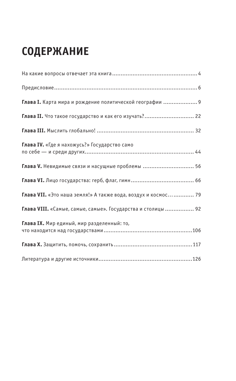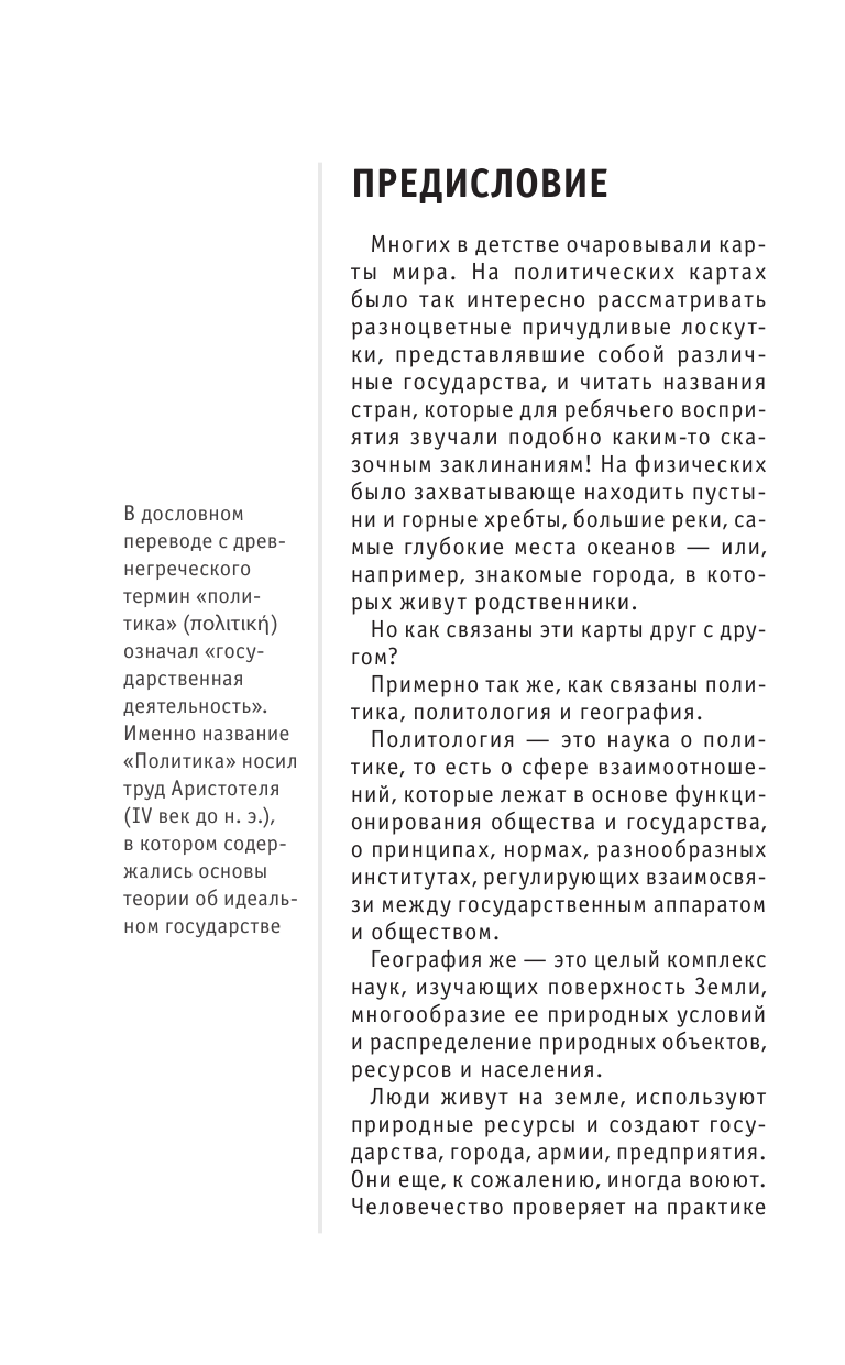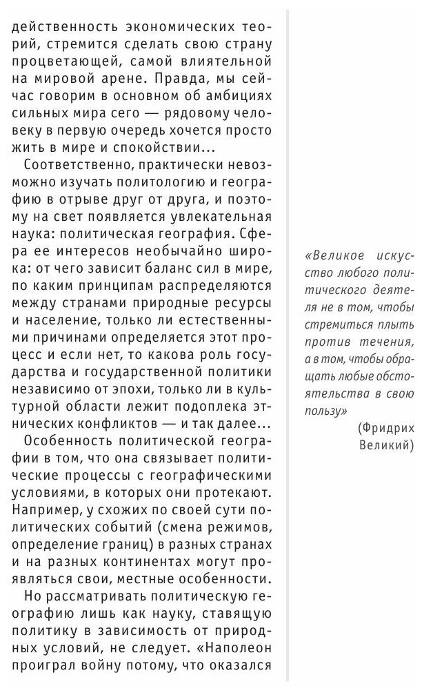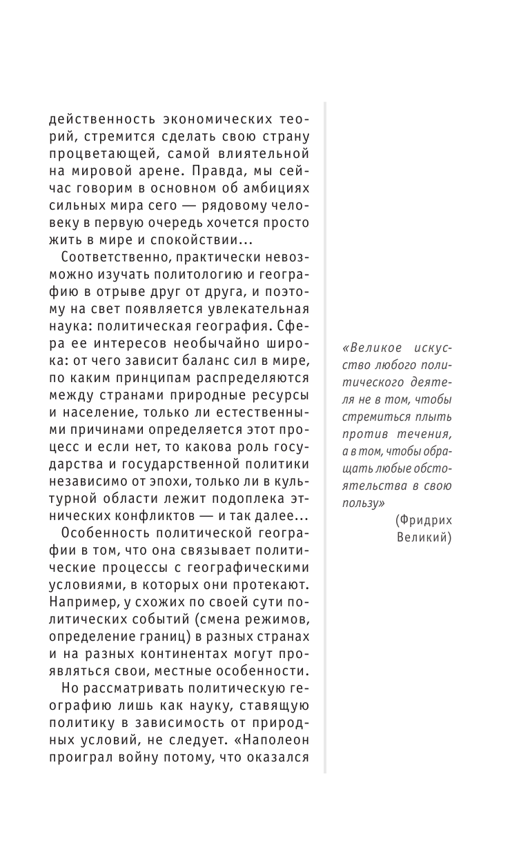 Из этой книги вы сможете в кратком изложении узнать от чего зависит баланс политических, экономических и военных сил в мире, по каким принципам распределяются между странами природные ресурсы и население, какова роль государственной политики той или иной страны независимо от исторической эпохи, только ли в культурной области лежит подоплека этнических конфликтов, — от чего зависит многое другое позитивное (культурные и научные связи, туризм, торговля) и негативное (войны, терроризм, национализм, ксенофобия) в нашей жизни.
