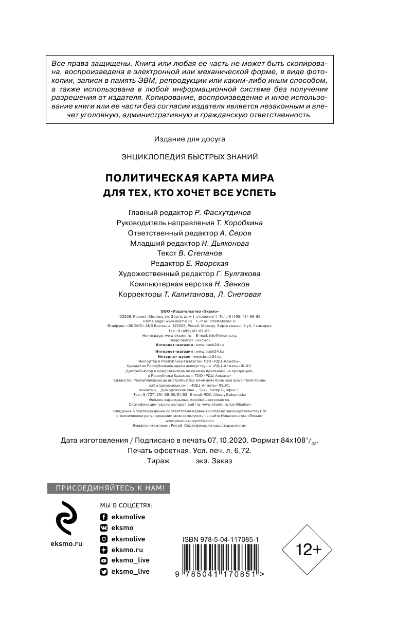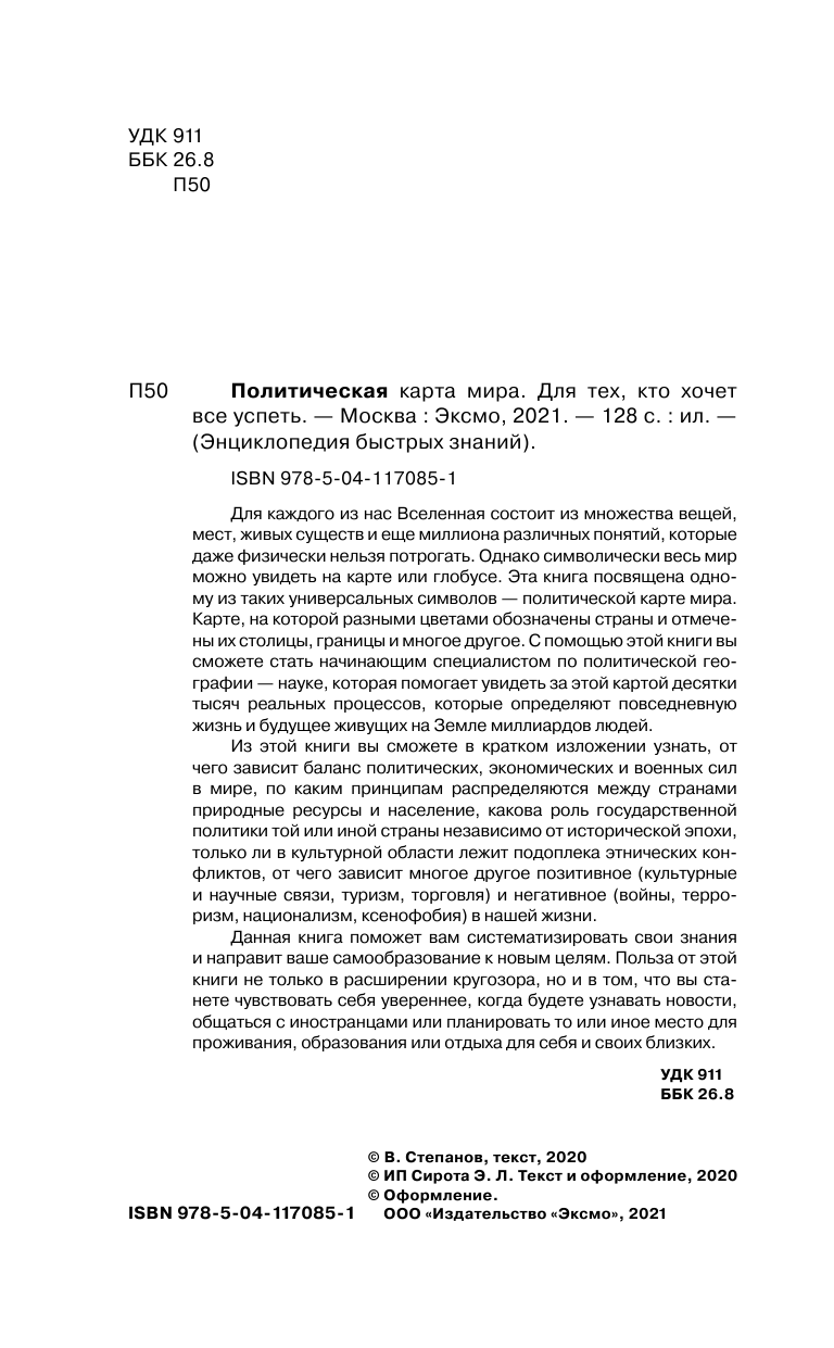 "Политическая карта мира. Для тех, кто хочет все успеть" - это, скорее, большая журнальная статья или брошюра, нежели Энциклопедия. Очень уж громкое заявление от издателя на счет энциклопедических знаний, содержащихся в этой книжке!