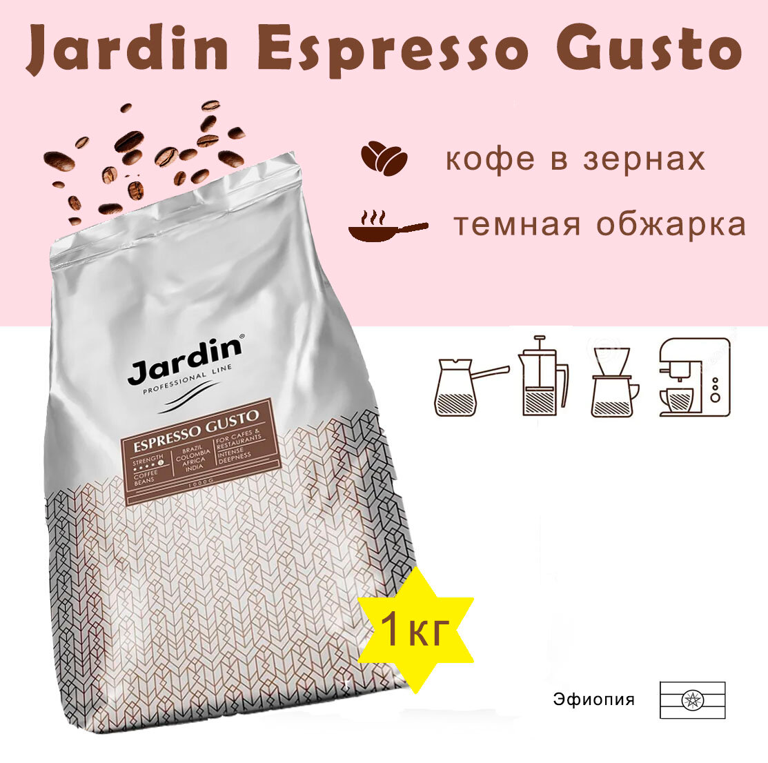 Jardin Кофе в зернах Espresso Gusto 1 кг Кофе в зернах Jardin Espresso Gusto обладает ярким многогранным вкусом, насыщенным ароматом и густой пенкой. Для разборчивых ценителей эспрессо. Темная обжарка кофейных зерен придает смеси интенсивный округлый вкус с едва уловимой кислинкой, сложный аромат и плотную текстуру. Послевкусие характеризуется сливочными нюансами. Состав 100% Арабика из Эфиопии, Южной и Центральной Америки.