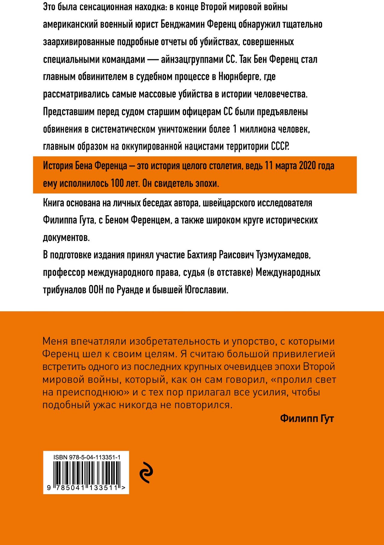 Это была сенсационная находка: в конце Второй мировой войны американский военный юрист Бенджамин Ференц обнаружил тщательно заархивированные подробные отчеты об убийствах, совершавшихся специальными командами — айнзацгруппами СС. Обнаруживший документы Бен Ференц стал главным обвинителем в судебном процессе в Нюрнберге, рассмотревшем самые массовые убийства в истории человечества. Представшим перед судом старшим офицерам СС были предъявлены обвинения в систематическом уничтожении более 1 млн. человек, главным образом на оккупированной нацистами территории СССР. Позже Ференц был центральной фигурой в переговорах о выплате Германией компенсаций жертвам Холокоста, внес весомый вклад в выработку Определения агрессии ООН и в создание Международного уголовного суда. Книга основана на личных беседах автора, швейцарского исследователя Филиппа Гута, с Беном Ференцем, а также широком круге исторических документов. Ответственным научным редактором российского издания выступил судья международных трибуналов ООН по Руанде и бывшей Югославии (в отставке), профессор Б.Р.Тузмухамедов, комментарии были подготовлены специалистом по немецкой истории, профессором О.Ю.Пленковым.