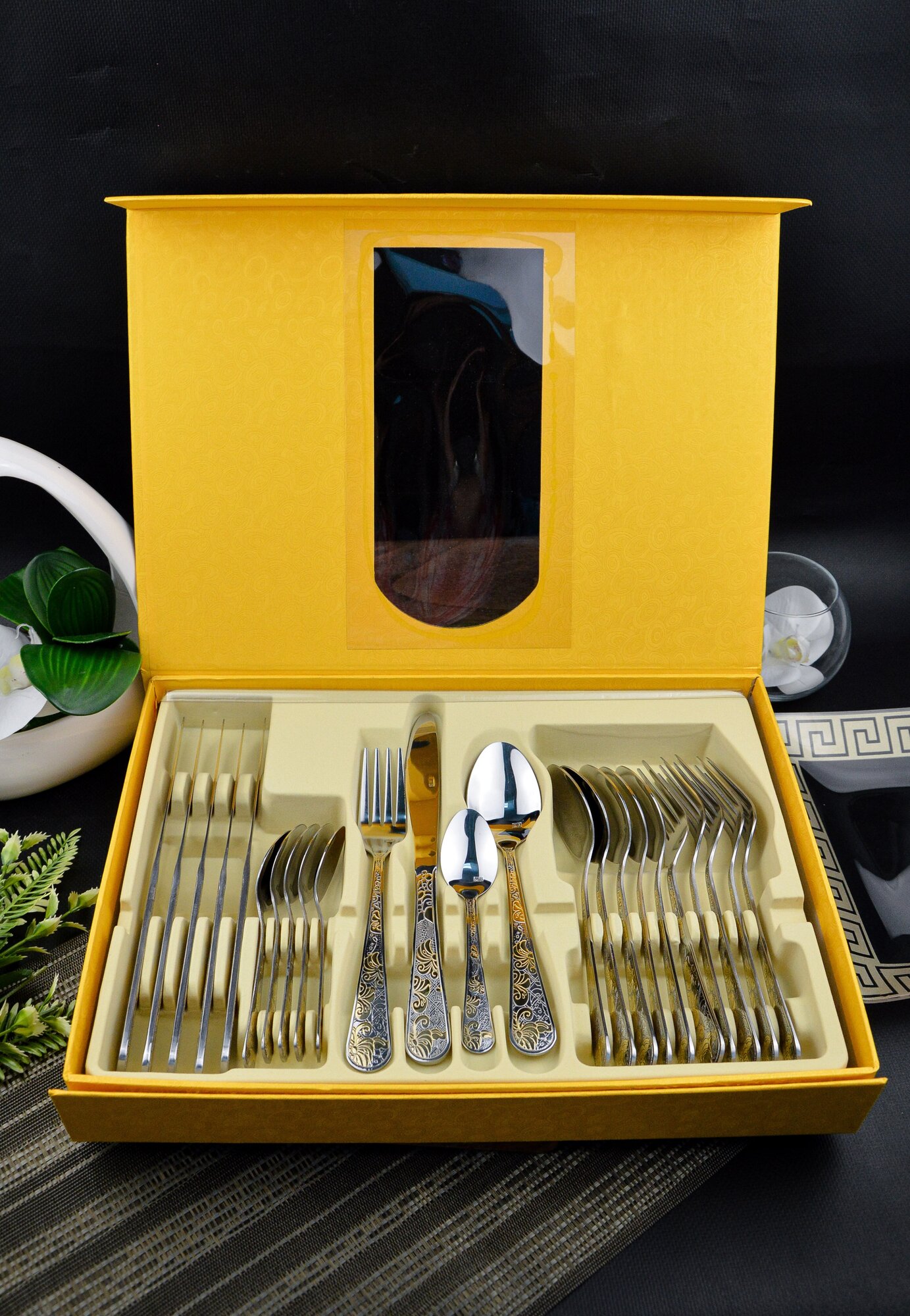 Набор столовых приборов MAYER&BOCH на 6 персон выполнен из высококачественной нержавеющей стали, ручки приборов имеют глянцевую полировку и декорированы изящным золотым орнаментом. Набор из 24-х предметов включает в себя: 6 столовых ложек, 6 вилок, 6 ножей и 6 чайных ложек. Благодаря качественной полировке, изделия сохраняют прекрасный внешний вид на долгое время. Набор обладает не только оригинальным дизайном, но и практичностью, так как изделия из качественной нержавеющей стали имеют высокую прочность, устойчивость к коррозии, кроме того, нержавеющая сталь экологична, она не меняет вкусовые свойства еды, потому как не вступает в реакцию с ее компонентами. Упакованный в красочную подарочную коробку такой набор безусловно станет прекрасным подарком для любой хозяйки и украсит ваш праздничный стол. Подходит для мытья в посудомоечной машине.