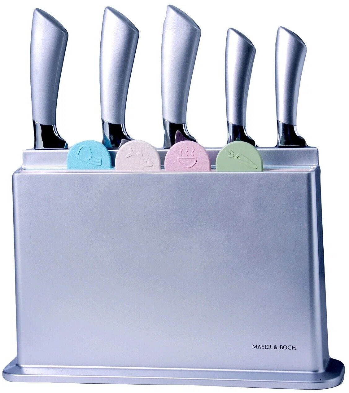 Набор 10 пр МВ (х6). Материал: нержавеющая сталь, полипропелен. Нож поварской: 33,5 см. Нож хлебный: 33,5 см. Нож разделочный: 33,5 см. Нож универсальный: 23,4 см. Нож для очистки: 19,8 см. Размер упаковки: 36,5 х 11,5 х 23,5 см. Вес: 2,400 кг. Страна производитель: Китай. Набор разделочных досок и ножей MAYER&BOCH состоит из четырёх разноцветных досок и пяти ножей, размещенных в оригинальной подставке, что делает набор не только многофункциональным, но и очень удобным для хранения на кухне. Цветные разделочные доски выполнены из прочного пищевого пластика и могут использоваться для нарезки сырого мяса и рыбы, овощей, фруктов, варенных и копченых продуктов, хлеба и т. д. Небольшой выступающий "ярлычок", имеющийся на каждой из досок, позволяет с легкостью извлекать их из подставки, а также служит удобной ручкой, за которую можно придерживать доску в процессе мытья. Каждый ярлычок отмечен рисунком продуктов, для которых предназначена доска: для рыбы, для мяса, для овощей и фруктов. Набор станет незаменимым и полезным аксессуаром на вашей кухне, который к тому же и стильно дополнит кухонный интерьер. Подходит для мытья в посудомоечной машине.
