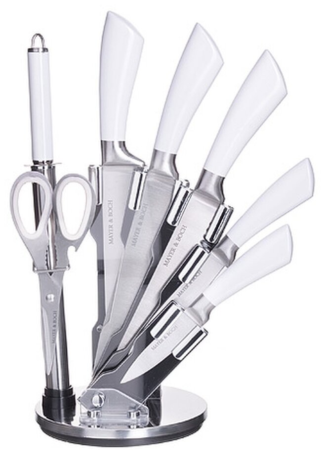 Высокая острота, надежное качество и стильный дизайн — это все, о нашем наборе кухонных ножей! Набор кухонных ножей MAYER&BOCH включает в себя 8 предметов: нож поварской, нож хлебный, нож разделочный, нож универсальный, нож для очистки, ножницы кухонные, мусат, подставка для ножей. Все предметы набора компактно размещаются на оригинальной акриловой подставке -"веере". Наш набор ножей с подставкой - это идеальный выбор истинных эстетов и профессионалов, прекрасное решение для тех, кто ценит надежные и качественные кухонные приспособления. Набор ножей с лезвиями из высококачественной нержавеющей стали станет незаменимым помощником на вашей кухне. Лезвия покрыты специальным антибактериальным Non-Stick покрытием, предотвращающим прилипание продуктов к лезвию ножа и обеспечивающим свежесть и гигиеничность продуктов при их нарезке. Поверхность клинков легко моется, не впитывает и не «передает» запахи пищи при параллельной нарезке различных продуктов. Нож поварской подходит от шинковки лука до разделки мяса. Хлебный нож гарантирует ровные ломтики не только свежей выпечки, но и позволяет нарезать продукты с жесткой кожурой, например, арбузы, дыни и ананасы. Нож разделочный обеспечивает чистую и аккуратную разделку мяса. Овощной нож идеален для нарезки картофеля или моркови, удобно чистить овощи и фрукты. Нож кухонный универсальный подойдет для капусты, для теста, для сыра, для хлеба, для чистки овощей, для фруктов, это прекрасная шинковка для мяса, для картошки и зелени. Универсальные кухонные ножницы прекрасно подходят для любого вида птицы и рыбы, идеально подойдут для вскрытия различных упаковок, нарезки зелени и салатов. Точилка для кухонных ножей идеально подходит для заточки ножей. Набор ножей кухонных на подставке не только поможет вам с легкостью и быстротой разделывать продукты питания, но и подарит удовольствие от использования. Яркий дизайн изделий украсит вашу кухню, а благодаря красивой упаковке, такой набор станет еще и прекрасным подарком!