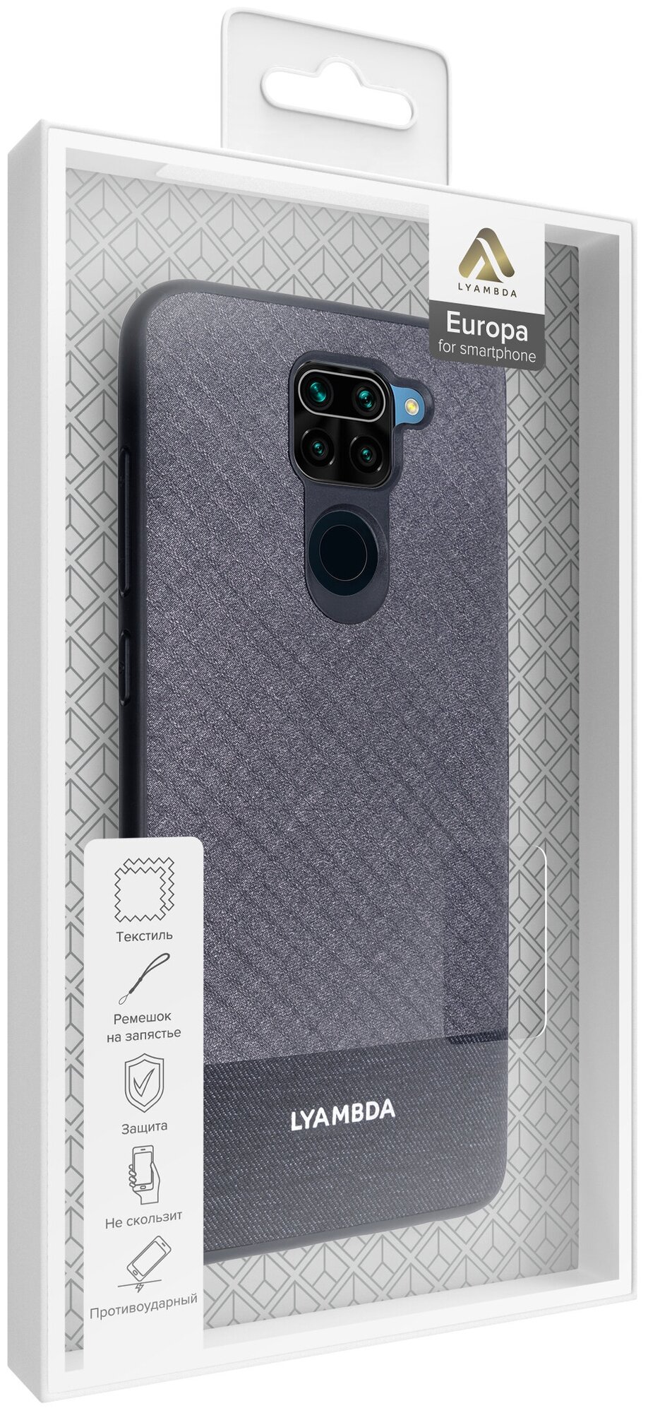 Чехол Lyambda серии Europa - это тонкий и прочный чехол-накладка для смартфона Xiaomi Redmi Note 9 выполнен из высококачественных материалов. Выполнен из высококачественного текстиля, в строгом изысканном стиле. Ткань не вытирается, чехол можно мыть под проточной водой.