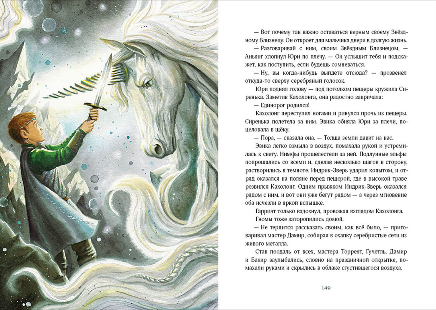 Завораживающая книга, купила в свою коллекцию - собираю иллюстрации с единорогами. Необычно и то, что автор русскоязычный, обычно изобилие таких существ в западных изданиях. Читаем потихоньку с детьми, заинтересовалась и малышка, и старшая, которая увлекается фэнтези. Хорошее издание и сказка удивляет.