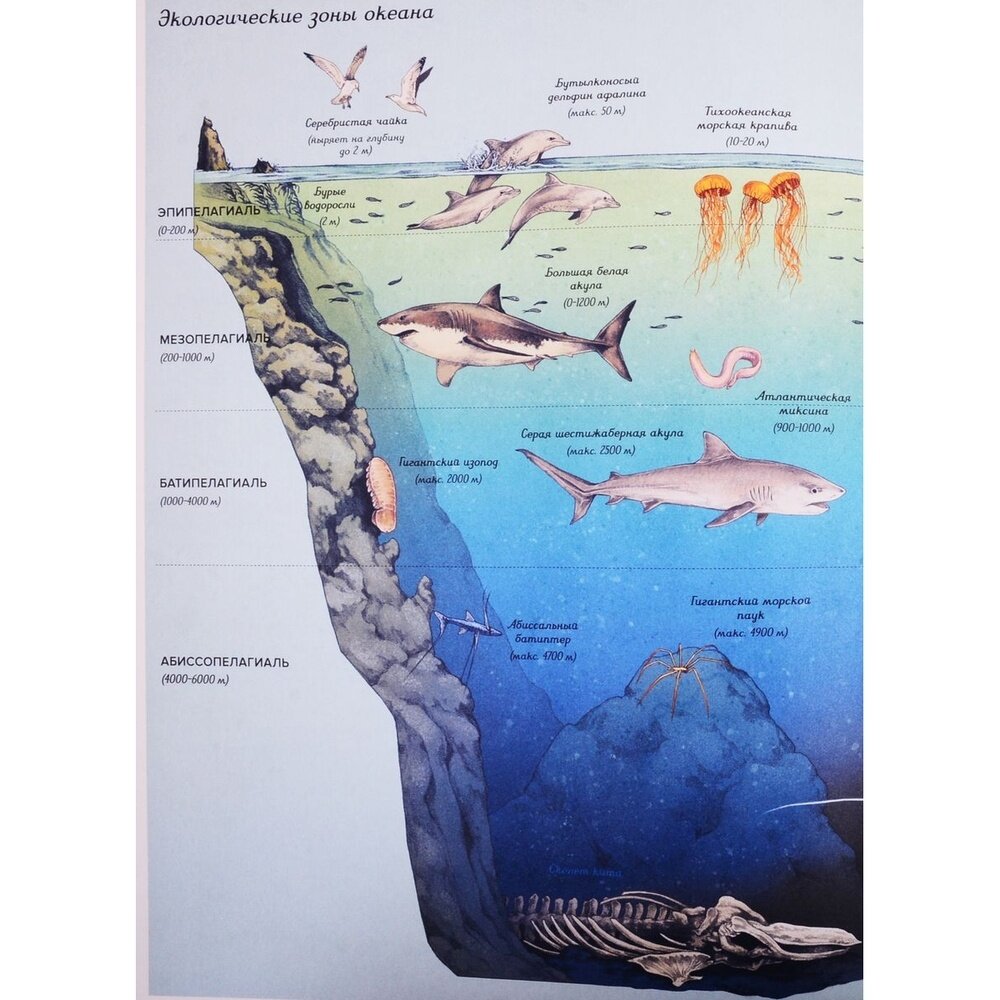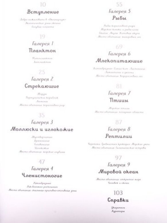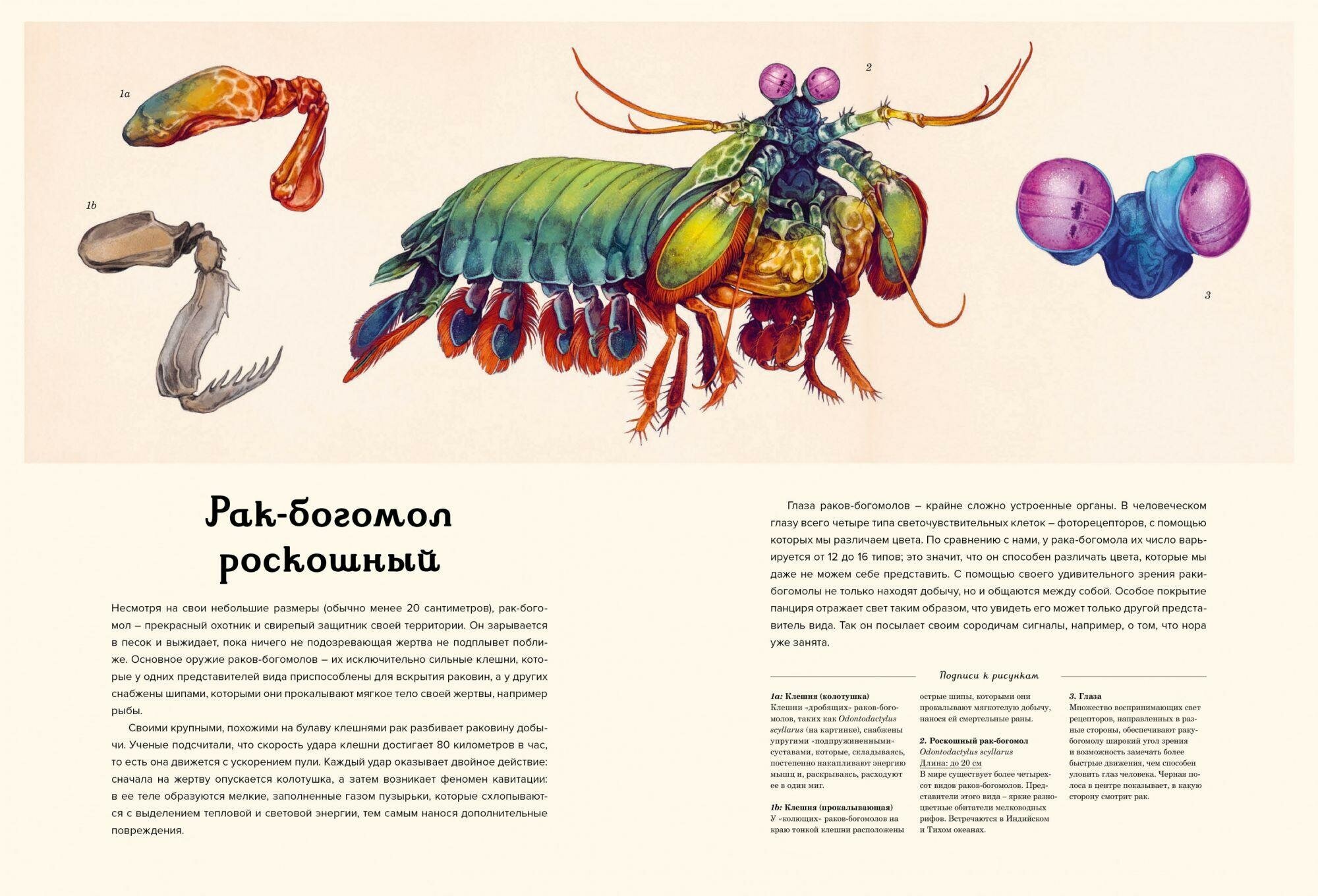 Красочные иллюстрации, подробное описание морских организмов. Выстроено в систему от простого к сложному. Начиная от планктона, через брюхоногих и ракообразных, до рыб, и заканчивая млекопитающими. Текст слева, рисунки справа. Для настоящих ценителей дублируются названия на латыни, в конце книги представлен указатель наименований на русском и латинском языках.