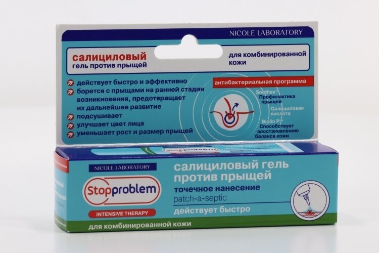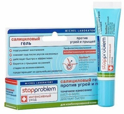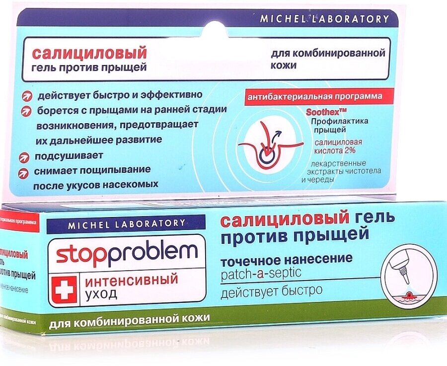 Точечный гель против высыпаний СтопПроблем быстро подсушивает прыщи и останавливает воспалительные процессы. Салициловый гель для лица Стоп Проблем против прыщей разработан для локального применения на проблемных участках кожи. Его активная формула эффективно борется с прыщами на ранней стадии возникновения, сокращает их количество и предупреждает дальнейшее появление. Салициловая кислота является антисептическим, антибактериальным и противовоспалительным средством, отшелушивает отмершие клетки кожи, уничтожает бактерии и снимает покраснение. Фитоэкстракты целебных трав обеспечивают комплексный терапевтический эффект. Экстракт чистотела нормализует деятельность сальных желез, борется с бактериями, осветляет проблемные участки, способствует их заживлению. Экстракт череды оказывает обезболивающее и успокаивающее действие, снимает зуд и воспаление. Не оставляет липкий слой, не требует смывания. Удобная туба позволяет экономично и гигиенично наносить продукт точечно на проблемные зоны.