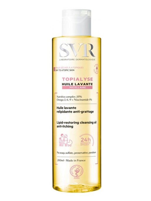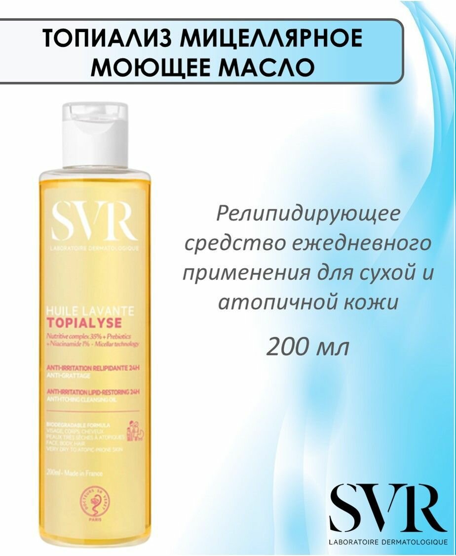 SVR Топиализ Мицеллярное моющее масло - релипидирующее средство ежедневного применения для сухой и атопичной кожи. Мягко очищает, не нарушая гидролипидную пленку Увлажняет и успокаивает Обладает противозудным эффектом Моментально приносит чувство комфорта. Может использоваться для лица, тела и интимной гигиены. Средство для всей семьи - для взрослых, детей и новорожденных. Не содержит парабенов, минеральных масел, сульфатов, ароматизаторов и красителей.Активные компоненты: питательный комплекс 35%: Омега 3,6,9 - восстанавливают липидный слой, защищают и увлажняют; ниацинамид снимает раздражение; пебиотический сахар восстанавливает баланс микрофлоры; мягкая моющая основа очищает, не пересушивая кожу.