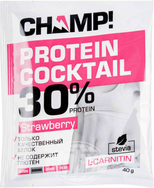 В составе нового клубничного протеинового коктейля Champ содержится только качественный молочный протеин, сывороточный белок, казеин, пребиотики, декстроза, стевия, L-карнитин, пищевые волокна. Незаменим для тех, кто ведет активный образ жизни, отличный вариант полезного перекуса с насыщенным клубничным вкусом. Не содержит глютен, также без добавления красителей и консервантов. Удовольствие с пользой для фигуры!