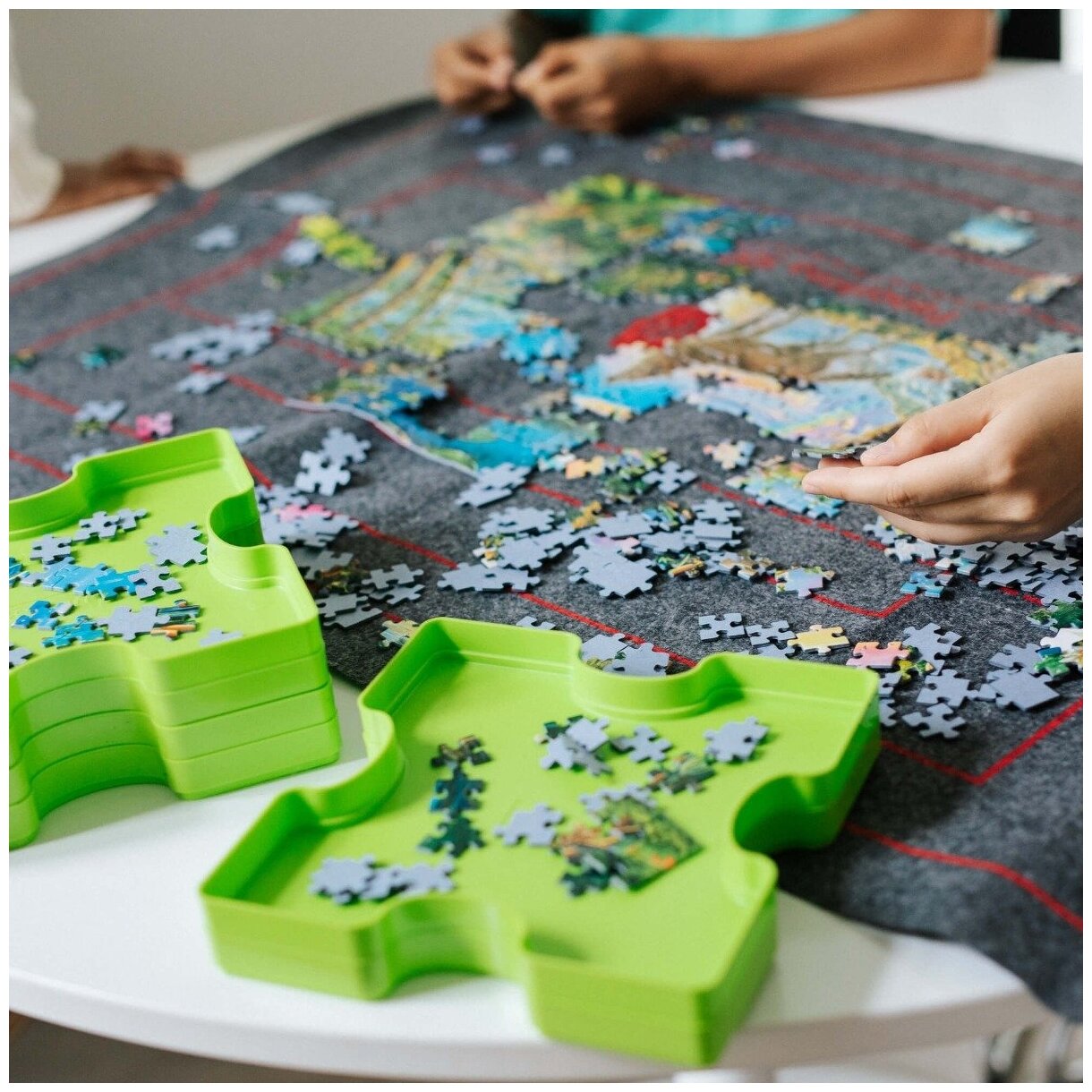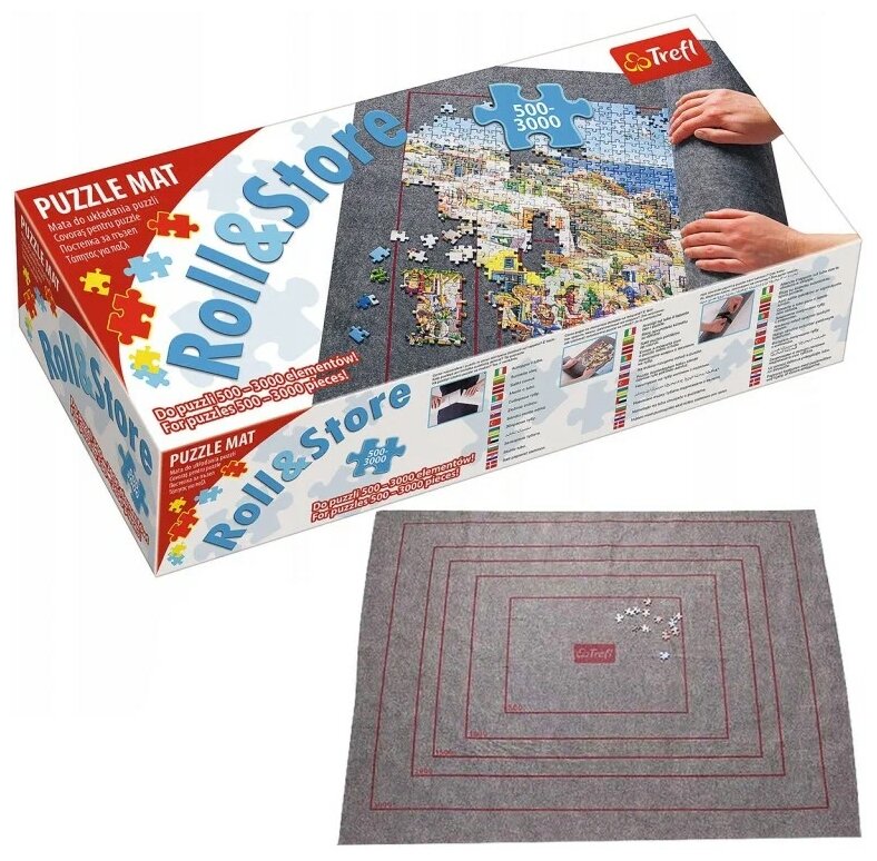 Коврик для сборки пазла Trefl позволяет расставлять и хранить собранные фрагменты картинки. Рамки на коврике подходят для пазлов на 500, 1000, 1500, 2000 и 3000 штук.