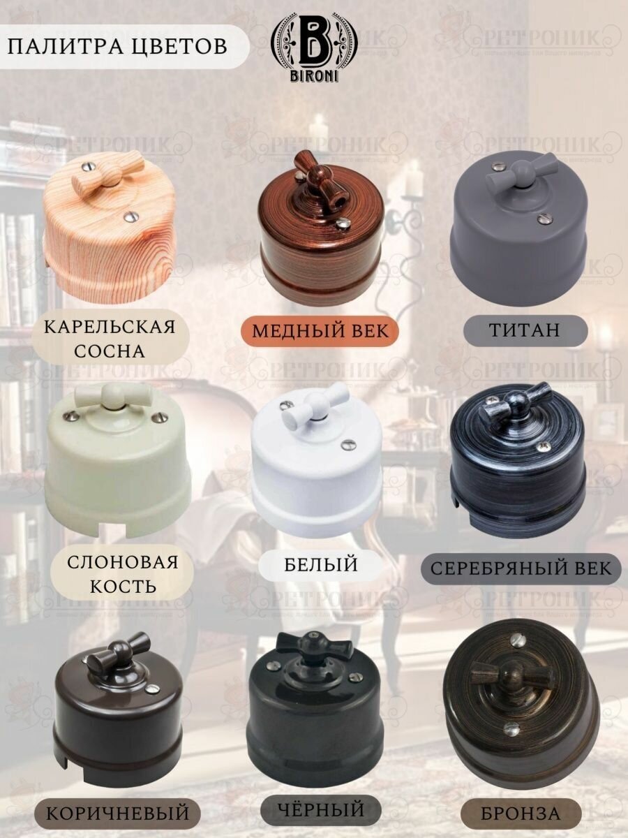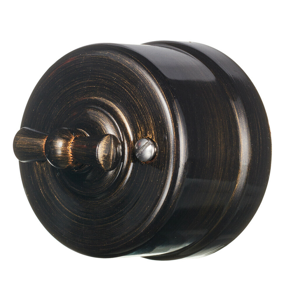 Винтажный ретро выключатель 1 клавишный (проходной), Bironi , Медный Век, пластикДанный выключатель BIRONI является одной из лучших моделей одноименной Российской компании, производителя широкой номенклатуры товаров в области ретро электрики. Фирма Bironi ответственейшим образом подходит ко всем этапам производства ретро выключателей - от проектирования до сертификации. Ретро выключатель не является исключением из правил. Благодаря своей расцветке и функциональным возможностям модель превосходно вписывается в любой жилой и нежилой интерьер. Высокая степень пыле-влагозащищенности позволяет безопасно использовать выключатель в деревянных сооружениях. Это, наряду с удобностью пользования представленным изделием выдвигают ретро выключатель Bironi на лидирующие позиции.Ретро выключатели прекрасно подходит для современных интерьеров. Винтажный выключатель BIRONI отличного качества. Он разработан с учётом всех современных требований, стандартов и гостов.Так как выключатели имеют популярный цвет. Не удивительно, что данный ретро выключатель часто используется дизайнерами, как при классических интерьерных решениях, так и в стилях лофт, стимпанк, эко.Ретро выключатель прекрасно сочетается в комплектации с интерьерными ретро проводами, наружными латунными трубками или даже с внутренней скрытой проводкой. Выключатель BIRONI выполнен из пластика, что придает такому интерьерному аксессуару особую лёгкость и шарм!