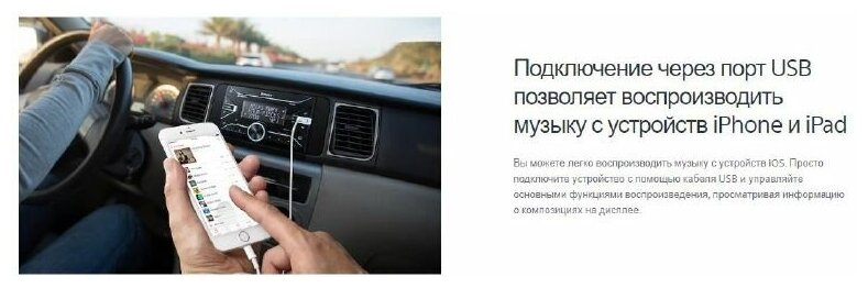Вы можете легко воспроизводить музыку с устройств iOS. Просто подключите устройство с помощью кабеля USB и управляйте основными функциями воспроизведения, просматривая информацию о композициях на дисплее.