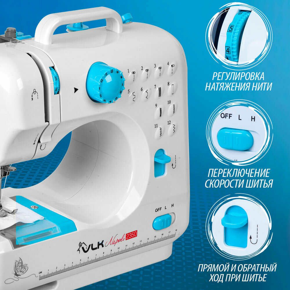 Электромеханическая швейная машинка VLK Napoli 2350 – это модель, которая сочетает в себе компактные размеры и все самые необходимые функции для шитья и воплощения ваших творческих идей.Швейная машинка Napoli 2350 - это отличный выбор как для профессионалов дела, так и для тех, кто только начинает пробовать свои силы в создании и реконструкции одежды.Модель Napoli 2350 удобна и легка в использовании. С помощью подсказок, нанесенных на корпус устройства, Вы сможете легко выбрать необходимый режим.Одним из преимуществ данной модели является то, что она может работать и от батареек, и от адаптера, благодаря чему Вам не обязательно иметь поблизости источник питания.Модель Napoli 2350 имеет 12 видов наиболее распространенных рабочих строчек, прямой и обратный ход при шитье, выбор скорости работы, обработка петель, вшивание молний и шитья рукавов.Благодаря отсеку для хранения Вы не потеряете такие аксессуары, как иглы, шпульки, швейные нитки и другие аксессуары.Комфортной работе способствует возможность регулирования давления лапки на ткань.Приятным дополнением является LED подсветка рабочей зоны, благодаря которой Вам будет гораздо легче выполнять работу. Легкий вес 2 кг делает модель более мобильной. Для Вашего удобства на корпусе устройства предусмотрена удобная ручка для перемещения.